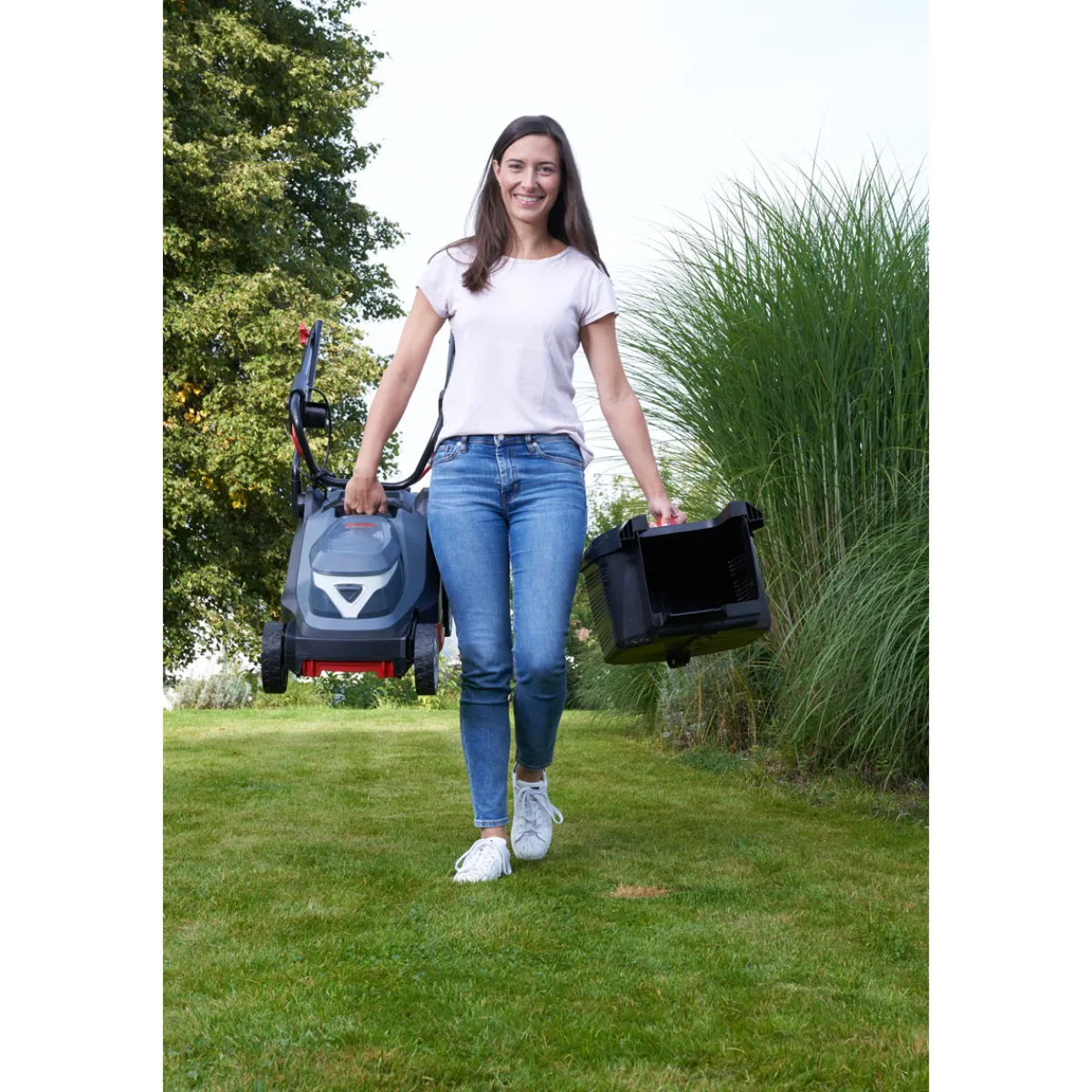 - Heckauswurf mit Fangboxvolumen von großzügigen 35 Litern reduziert häufiges Entleeren beim Mähen.