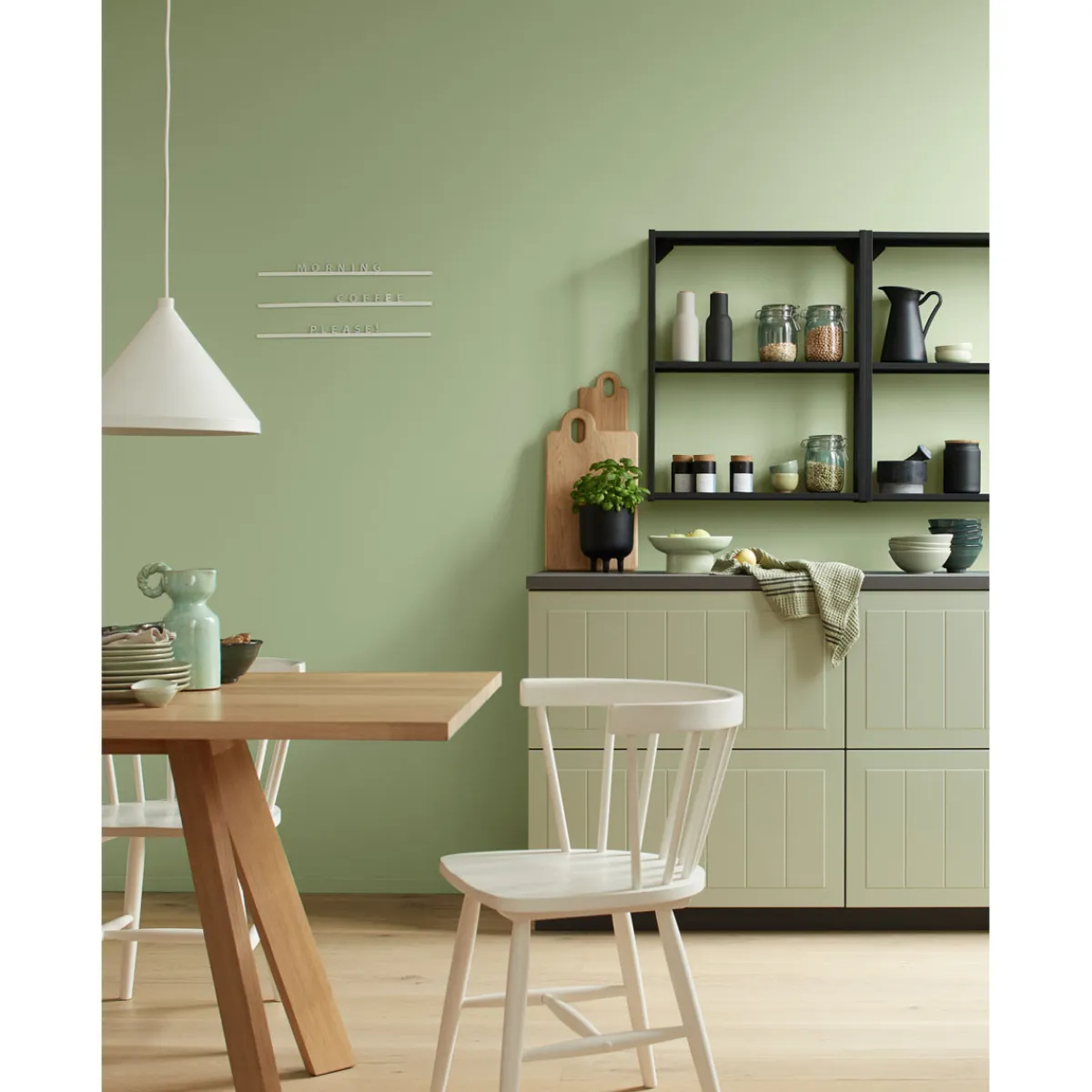 Pistaziengrün gibt der Wand mit seiner Mischung aus Grün und einem Schuss Grau eine sanfte und beruhigende Ausstrahlung. Umso mehr, wenn du mit viel natürlichem Holz kombinierst.
