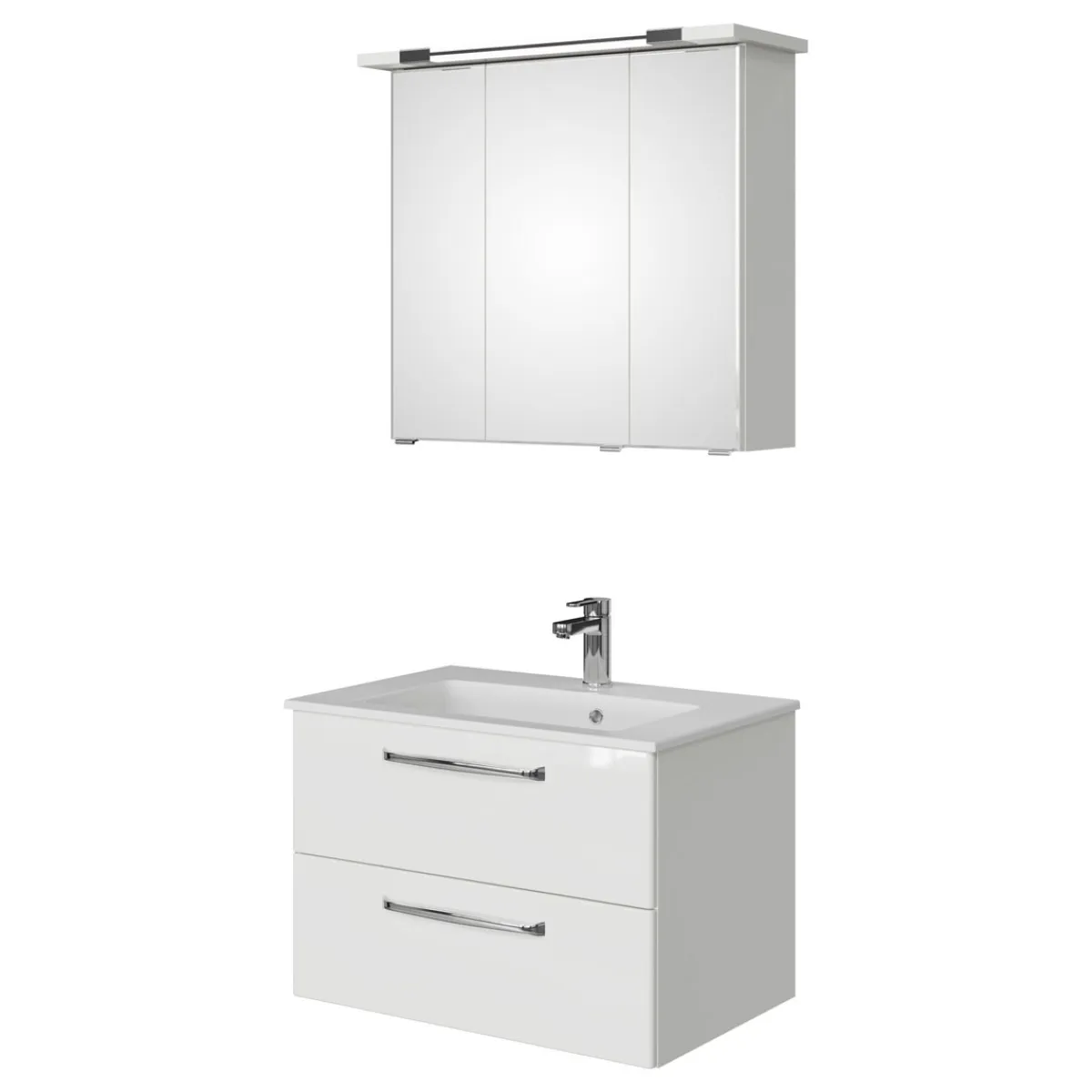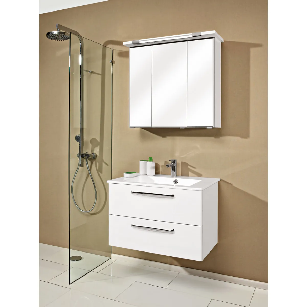 - Inhalt: Waschtischunterschrank, Mineralmarmor-Waschbecken, Spiegelschrank mit LED-Beleuchtung