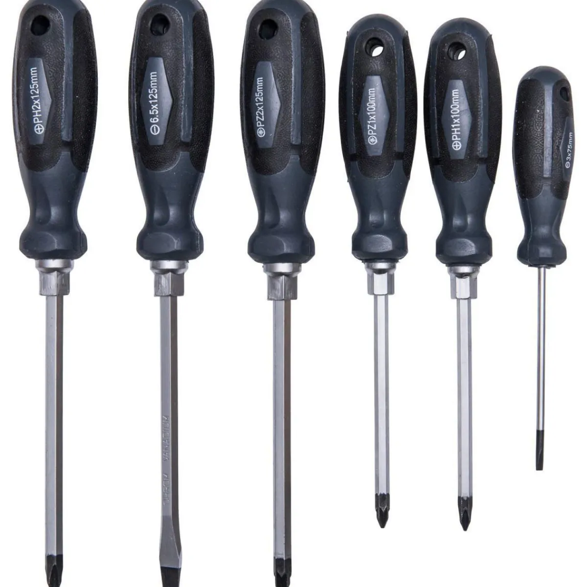 - – Set besteht aus: 1x Schlitz 3,0 x 75mm, 1x Schlitz 6,5 x 125mm mit Sechskantansatz, 1x Kreuzschlitz PH1 mit Sechskantansatz, 1x Kreuzschlitz PH2 mit Sechskantansatz, 1x Pozidriv PZ1 mit Sechskantansatz und 1x Pozidriv PZ2 mit Sechskantansatz