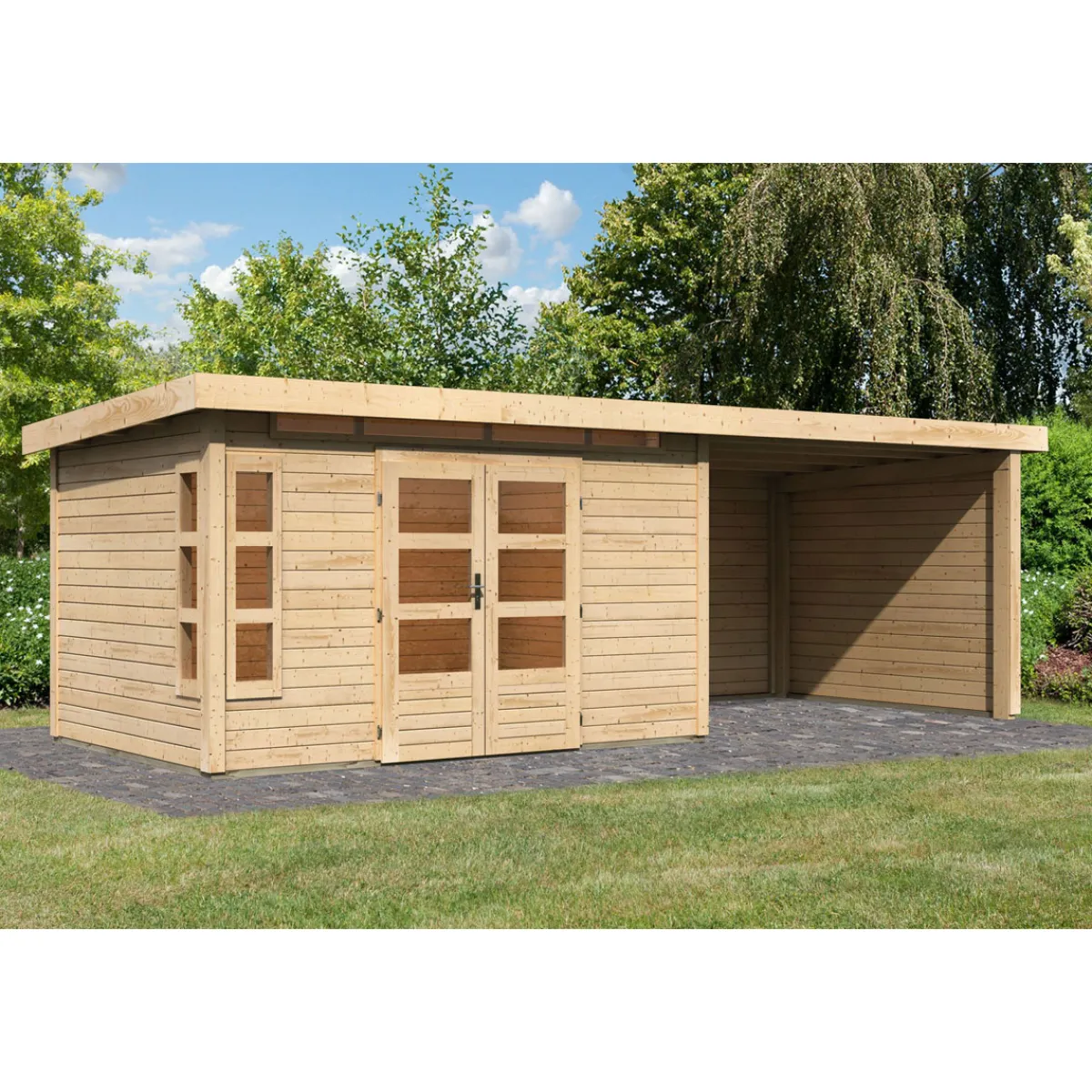 Blockbohlenhaus Kastorf 6 naturbelassen mit Anbaudach und Seiten*Karibu Outlet