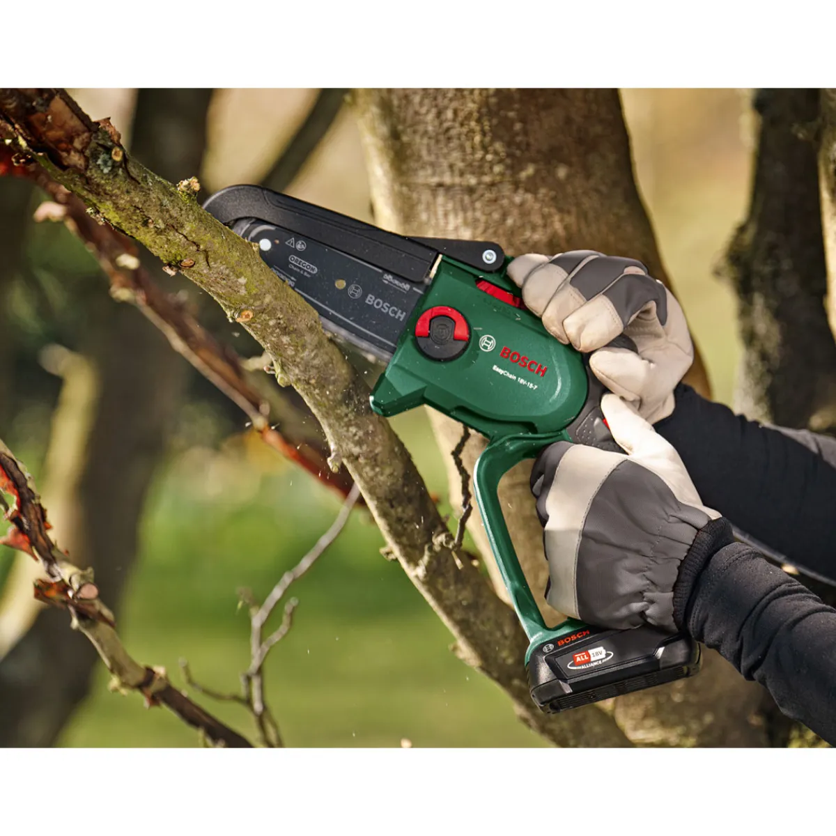 Die kabellose EasyChain 18V-15-7 schneidet kraftvoll und schnell durch dickere Äste. Diese Säge lässt sich dank des werkzeuglosen SDS-Systems mühelos einsatzbereit machen und liefert eine hohe Schnittgeschwindigkeit von 6,95 m/s, während eine hochwertige Sägekette von Oregon durch Holz bis 13 cm Durchmesser schneidet. Das kompakte, gut ausbalancierte Design und Handgriffe mit Softgrip ermöglichen müheloses Arbeiten. Erledige alle Ausastungs- und Sägearbeiten in kürzester Zeit mit beeindruckenden 160 Schnitten pro Akkuladung*. (* mit 2,5-Ah-Akku) Die integrierte Bosch Syneon Technology sorgt für optimale Leistung und maximale Laufzeit. Das Gerät ist Teil des 18V POWER FOR ALL-Systems. Ein einziger Akku kann für alle 18V POWER FOR ALL-Werkzeuge verwendet werden.