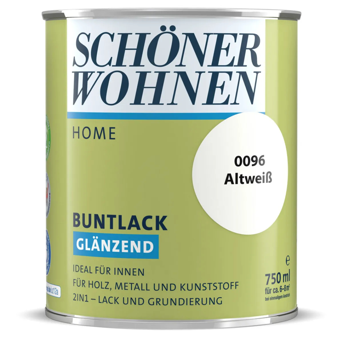 Mit dem Schöner Wohnen Farbe Buntlack Home in Altweiß glänzend verleihen Sie Ihren Möbeln, Fenstern, Türen und Zäunen im Innen- und Außenbereich ein neues Aussehen. Die schnelle Trocknung und hohe Wetterbeständigkeit machen diesen Buntlack zu einem idealen Begleiter für Ihre Renovierungsprojekte.
