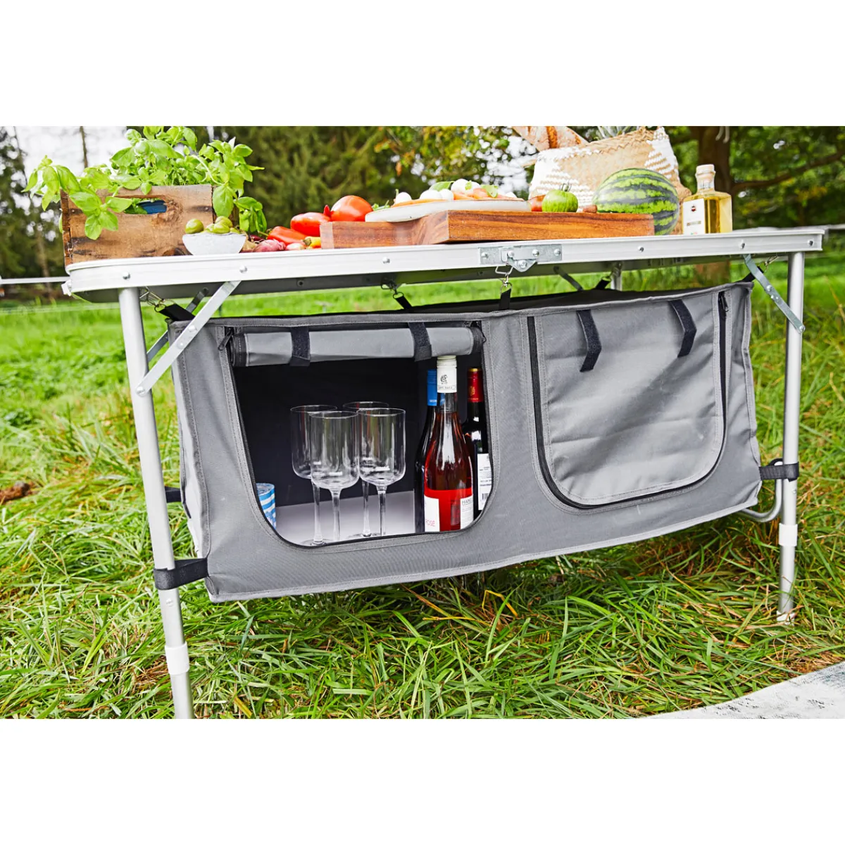 Dieser Tisch ist perfekt für alle, die gerne campen oder Outdoor-Aktivitäten unternehmen und dabei nicht auf Komfort verzichten möchten. Auch für Familienausflüge oder Picknicks im Park ist er bestens geeignet.