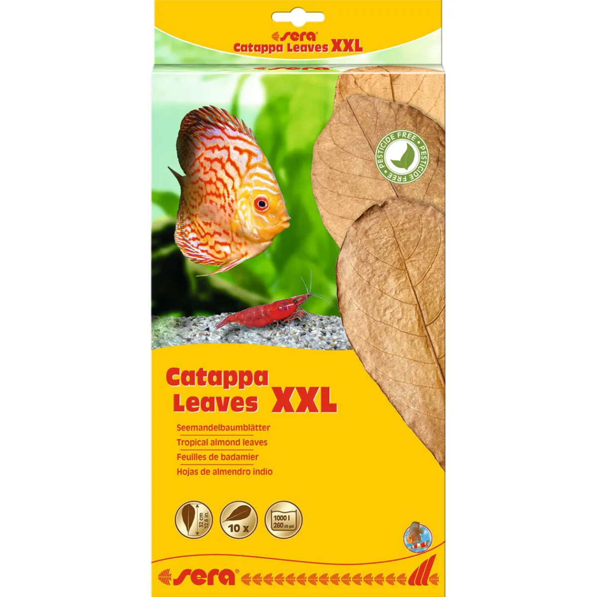 Mit den sera Catappa Leaves XXL kann das Wasser wie in natürlichen Biotopen aufbereitet werden. Die Seemandelbaumblätter fördern das natürliche Verhalten sowie die Laichbereitschaft von Zierfischen und Garnelen. Außerdem beugen sie bakteriellen Infektionen und Verpilzungen vor. Dank ihrer adstringierenden Eigenschaften unterstützen sie den Heilungsprozess bei Verletzungen. Garnelen, Krebse und Welse nehmen die Seemandelbaumblätter gerne als zusätzliche Nahrung an. Anwendung: Ein Blatt für 100 l Aquarienwasser in das Becken geben. Die Blätter sinken innerhalb von 24 – 48 Stunden. Tipp: Durch vorheriges Überbrühen sinken sie umgehend und können besser verdaut werden. Die Wirkstoffe werden über 2 – 3 Wochen abgegeben. Naturprodukt mit möglichen Abweichungen in Form, Farbe und Größe.