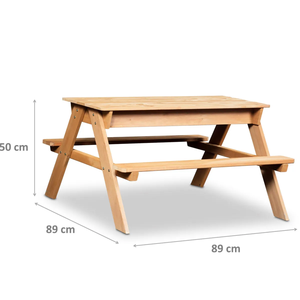 Diese stilvolle Kombination aus Picknicktisch und Sand- und Wasserspieltisch überzeugt durch multifunktionalen Gebrauch. Dank der abnehmbaren Tischplatte lässt sich der Tisch schnell in eine Matschkiste umfunktionieren. Unter der Abdeckplatte befinden sich zwei blaue Kunststoffwannen, die leicht mit Sand und Wasser zu befüllen sind. Hier können die Kleinen nach Herzenslust matschen und plantschen oder mit Sandkastenförmchen spielen. Die Wannen können leicht entfernt und gereinigt werden. An der Sitzgruppe mit Tisch und zwei Bänken finden bis zu vier Kinder bequem Platz, um zu picknicken, basteln, malen oder zeichnen – egal ob draußen im Garten, auf Balkon und Terrasse oder drinnen im Kinderzimmer.