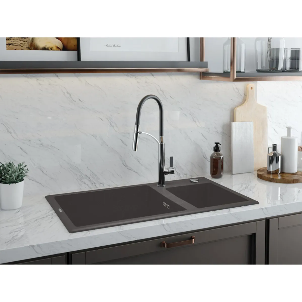 Wer auf der Suche nach einer hochwertigen Spüle mit modernem Design ist, wird von der deante 1,5 Becken Granitspüle ERIDAN begeistert sein. Das robuste Material aus Granit sorgt dafür, dass die Spüle langlebig und pflegeleicht bleibt. Durch das Fehlen einer Abtropffläche wirkt das Gesamtbild besonders minimalistisch. Mit ihrer eckigen Form fällt sie zudem sofort ins Auge. Für alle Kunden mit einem Unterschrank ab einer Größe von 90 cm ist diese Spüle eine ausgezeichnete Wahl.