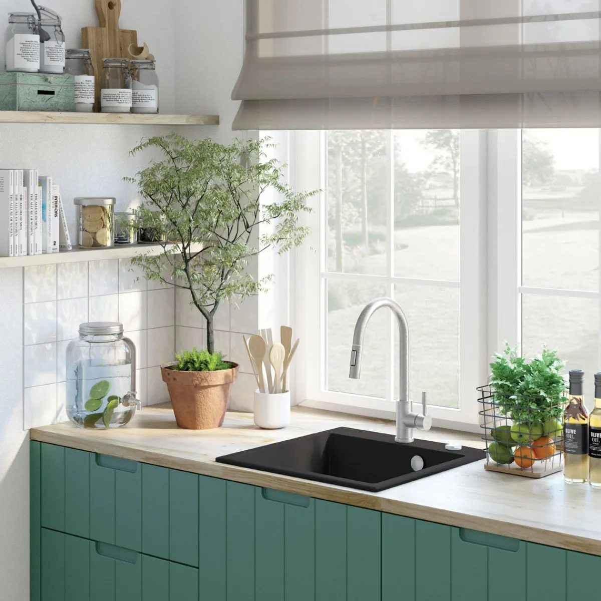 Die Spüle Evora wurde mit Blick auf Funktionalität und Ästhetik entworfen. Sie hat ein tiefes, quadratisches Becken und zusätzliche Unterfräsungen für einen automatischen Stöpsel oder einen Spülmittelspender. Das Produkt besteht aus Granit, der gemäß der europäischen Norm EN 13310 stoß-, hitze-, verfärbungs- und temperaturwechselbeständig ist. Die Spüle ist in mattem Graphit ausgeführt und mit einem Space-Saver-Siphon mit automatischem Stopfen ausgestattet.