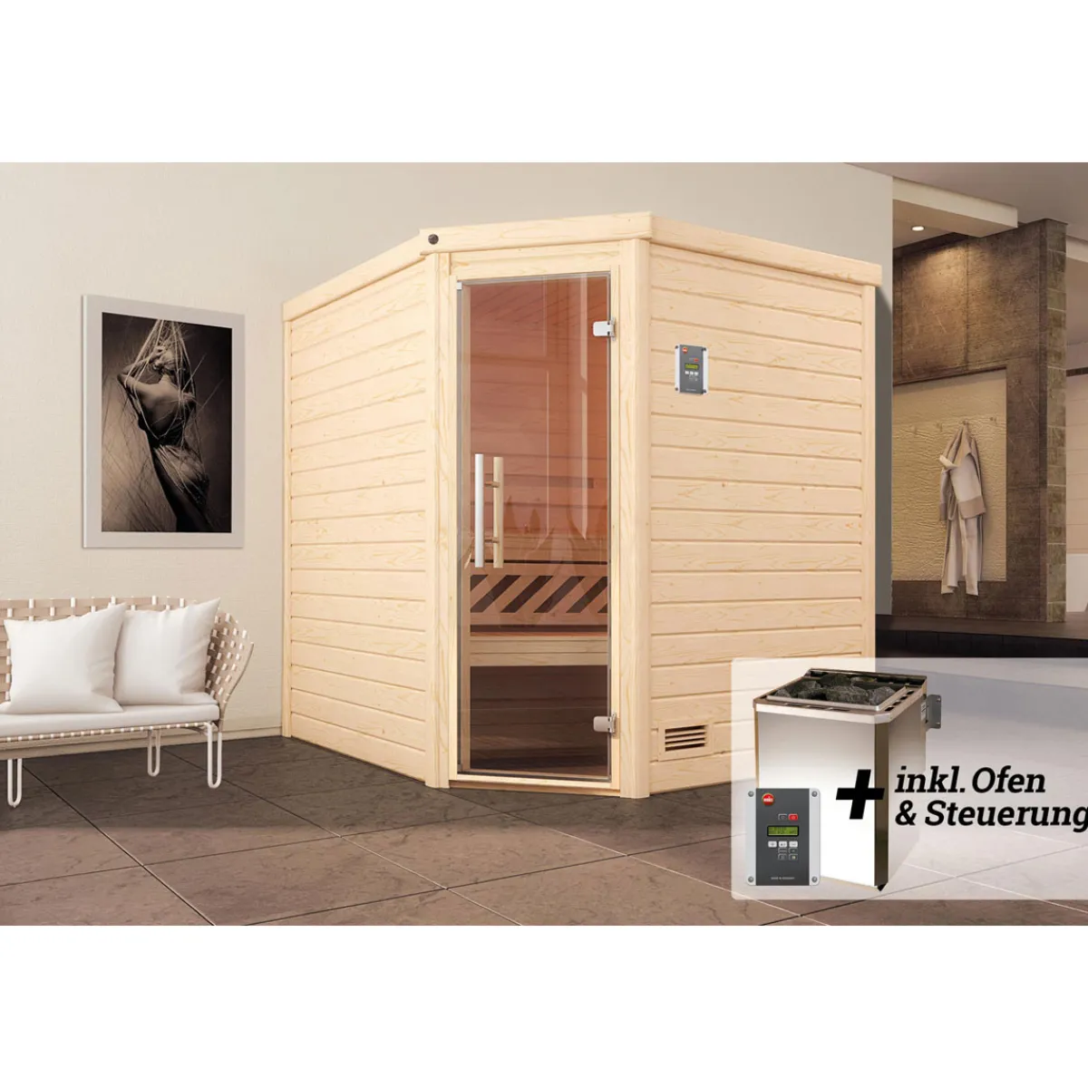 Tauchen Sie ein in die Welt der Entspannung mit der Weka Design-Sauna Cubilis Größe 1 Sparset. Mit hochwertigem Fichtenholz und moderner Ganzglastür bietet diese Sauna nicht nur eine angenehme Atmosphäre, sondern auch einen Blick nach draußen.