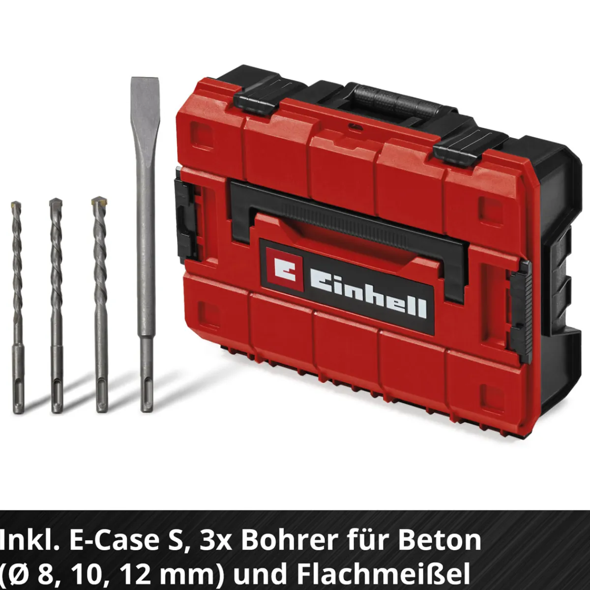 - Lieferumfang inklusive Transportkoffer E-Case S sowie drei Bohrer (Ø8, Ø10, Ø12) und einem Flachmeißel