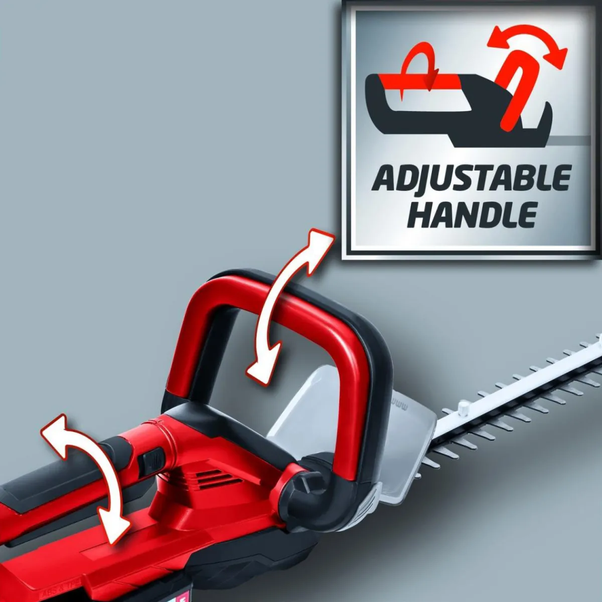 Die Einhell Akku-Heckenschere GE-CH 1855/1 Li – Solo ist ein zuverlässiger Helfer im Garten. Mit einer maximalen Schnittleistung von 18 mm und einer Schnittlänge von 55 cm können auch größere Hecken problemlos bearbeitet werden. Der Drehgriff und der verstellbare Zusatzhandgriff sorgen dabei für eine ergonomische Handhabung. Durch das geringe Gewicht lässt sich die Heckenschere auch über längeren Zeitraum komfortabel nutzen. Bitte beachten Sie, dass kein Akku oder Ladegerät im Lieferumfang enthalten sind.