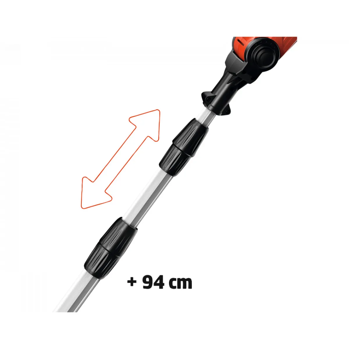 - Ausstattung Hochentaster: Bügelgriff, Schultergurt, Schwenkbarer Trimmerkopf, Verstellbarer Griff, Verstellbarer Zweihandgriff