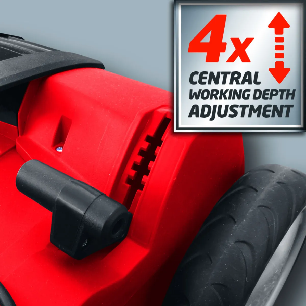 - – Vierstufige zentrale Arbeitstiefeneinstellung mit Parkposition für eine individuelle Anpassung an den Rasenzustand