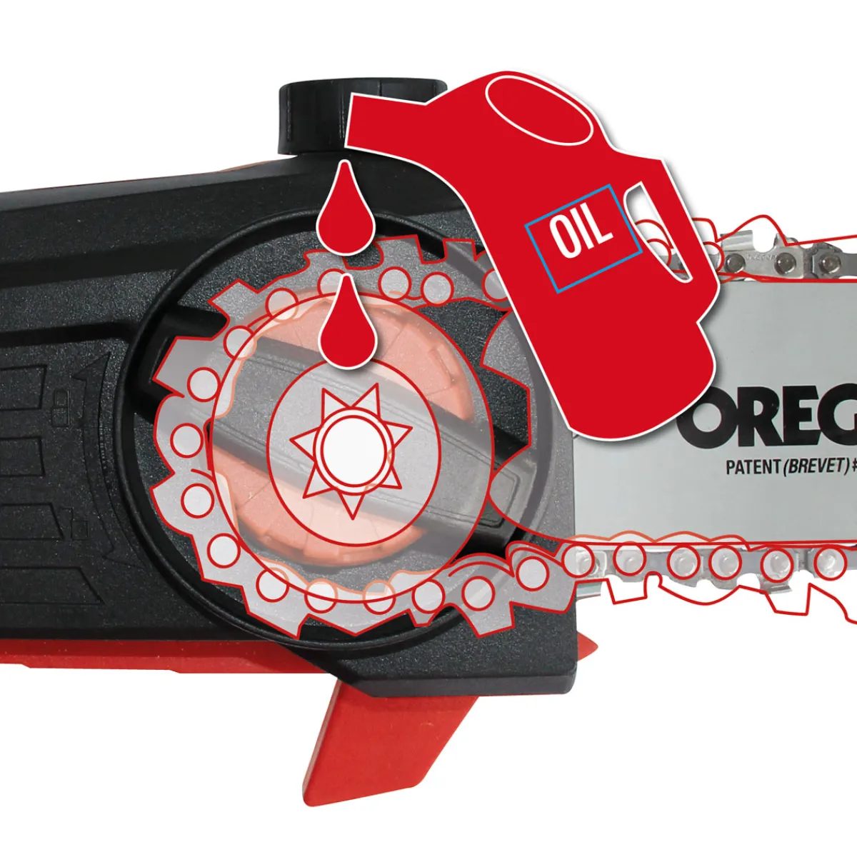 - Automatische Kettenschmierung verhindert ein Austrocknen der Kette während des Betriebs