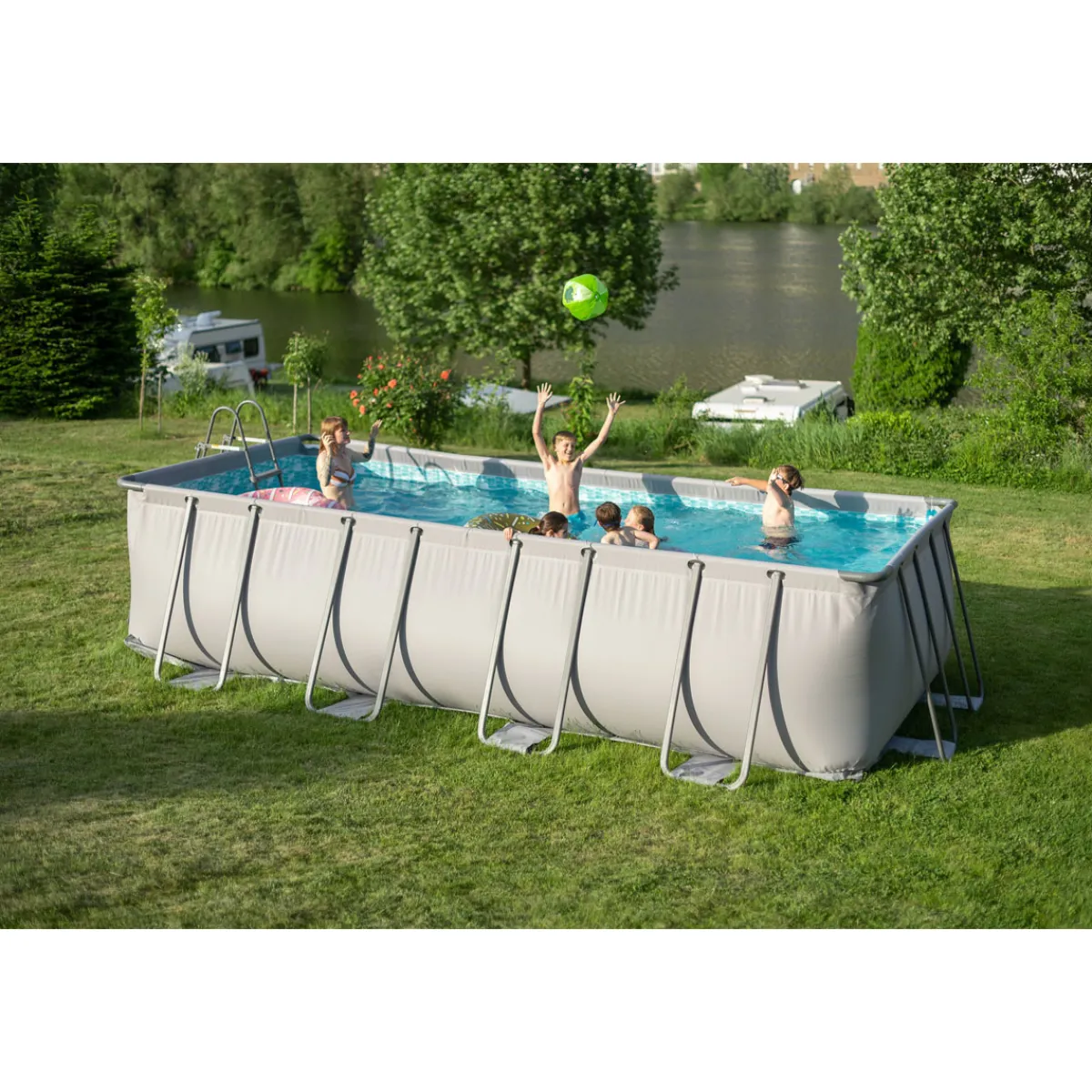 Summer Waves Elite Frame Pool Aufstellpool rechteckig Komplettset Grau 549x274x132 cm Abkühlung, Erfrischung und Poolspaß ohne Ende — klingt das nicht hervorragend? Der Elite Frame Pool von Summer Waves punktet mit umfangreicher Ausstattung und zuverlässiger Qualität. Verwandele deinen Garten mit dem rechteckigen Aufstellpool und wenig Aufwand in eine sommerliche Pooloase! Schneller Aufbau und Poolspaß pur mit deinem Komplettset! Durch das innovative Snap-in System ist der Pool im Nu aufgebaut. Die hochwertigen Rahmenrohre aus Metall gewährleisten in Verbindung mit der strapazierfähigen Poolfolie aus einem 3-lagigen PVC-Polyester-Mix eine hohe Widerstandsfähigkeit und Stabilität. Die Highlights auf einen Blick: * Komplettset mit exklusivem Zubehör! * Robuste Poolkonstruktion für langanhaltenden Badespaß * Maximale Stabilität durch massive Stahlrohr-Konstruktion * Hohe Belastbarkeit dank 3-lagiger PVC-Polyester-Mix Folie * Schneller und einfacher Aufbau durch Snap-in Verfahren * Füllmenge bei 90 %: 17.871 Liter Platz für ca. 7 Personen * Zeitloses Design in cleanem Grau kombiniert mit Mosaikmuster Maximale Sauberkeit dank zuverlässiger Technologie! Die mitgelieferte Sandfilterpumpe reinigt das Wasser effektiv und sorgt für klare Verhältnisse. Verunreinigungen werden durch die effiziente Filtertechnologie kontinuierlich entfernt, sodass du den ganzen Sommer über kristallklares Wasser genießen kannst. Im Lieferumfang enthalten: * Sandfilterpumpe * Einstiegsleiter * Abdeckplane und Bodenvlies * Reinigungsset Erlebe maximalen Badespaß, Abkühlung pur und unvergessliche Sommermomente mit dem großen Summer Waves Elite Frame Pool!