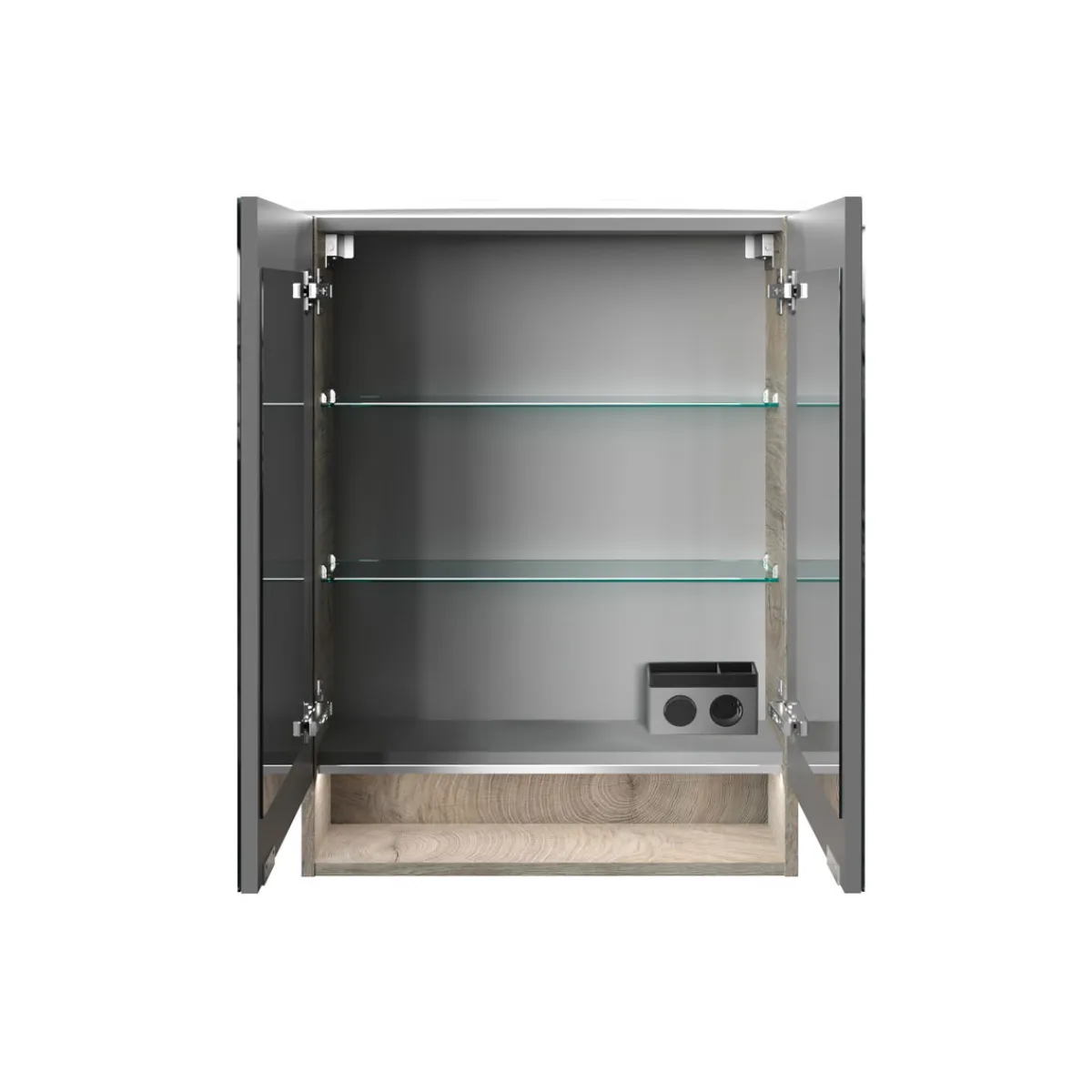- Ausgestattet mit 2 innenverspiegelten Türen und 2 Glaseinlegeböden