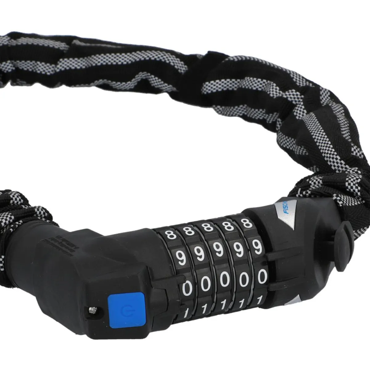 Sichern Sie Ihr Fahrrad mit dem Fischer Bikes Kettenschloss. Das Schloss verfügt über ein Zahlencodesystem und ist mit Reflektoren ausgestattet, um auch bei Dunkelheit gut sichtbar zu sein.