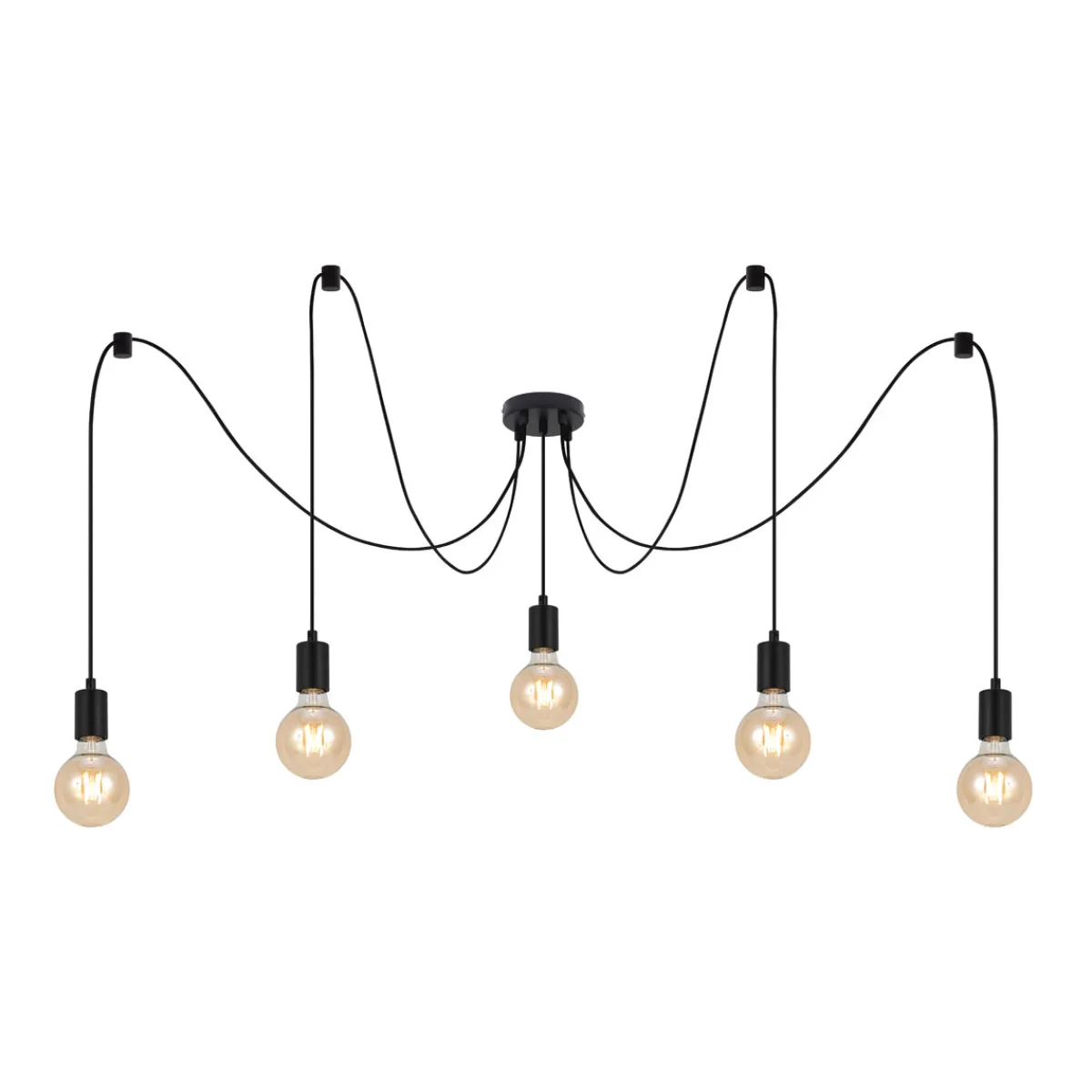 Die Flector Deckenleuchte Spider in Schwarz ist ein echter Hingucker und verleiht jedem Raum eine besondere Atmosphäre. Mit einer Textilkabellänge von insgesamt 10 Metern und Platz für bis zu fünf E27/max. 60 W Leuchtmittel (nicht enthalten) bietet die Leuchte genügend Flexibilität, um individuelle Lichtakzente zu setzen.