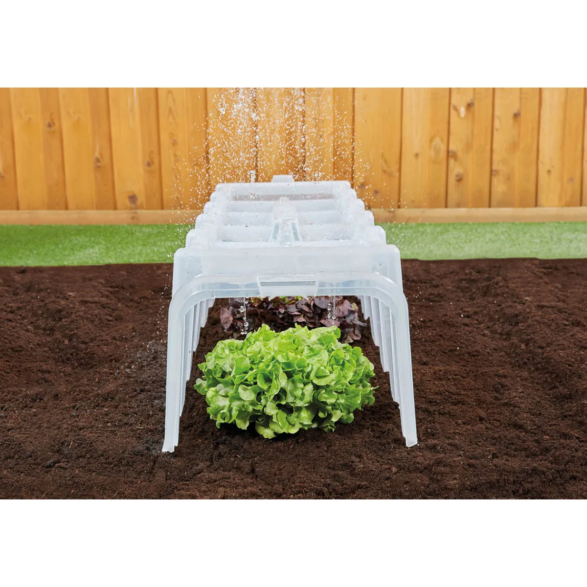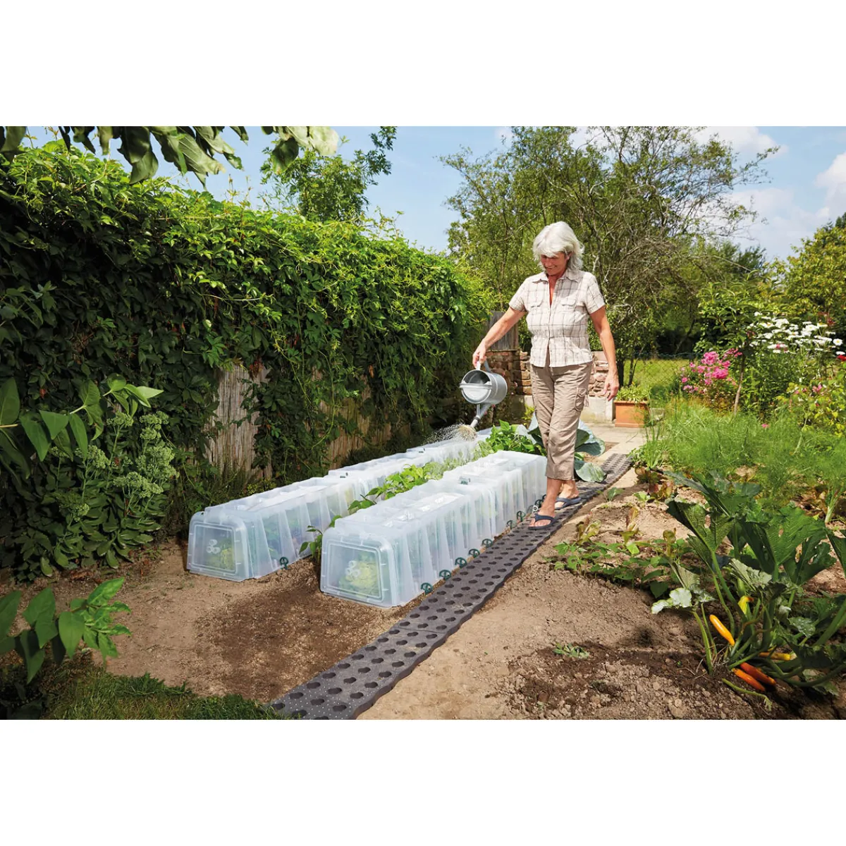 Garantia SUNNY Pflanztunnel 5er-Komplettset – Das robuste Pflanztunnelsystem mit Komfortbelüftung und Bewässerungsfunktion! Die GARANTIA Sunny Pflanzhilfen sorgen für die ideale Aufzucht von Pflanzen und Gemüse. Ein feuchtwarmes Mikroklima im Inneren fördert das Wachstum der Pflanzen. Der Aufbau des Sunny Pflanztunnels geht einfach und schnell – ohne Werkzeug. Durch einfaches Zusammenstecken mehrerer Tunnelelemente kann der Sunny Pflanztunnel individuell an Ihre Gartengröße und Bedürfnisse angepasst werden. Die Elemente werden mit Bodenankern fixiert und mit Endkappen an der Vorder- und Rückseite verschlossen. So entsteht nach kürzester Zeit ein „Mini-Gewächshaus“ für Ihre Pflanzen. GARANTIA Sunny Pflanzhilfen werden aus qualitativ hochwertigem Kunststoff hergestellt und sind somit jahrelang verwendbar. Zudem sind die Pflanztunnel die wirtschaftliche und flexible Alternative zum klassischen Frühbeet oder zum kurzlebigen Folienpflanztunnel. Dank ihrer dickwandigen Konstruktion sind sie äußerst robust – witterungsbeständige Materialien mit hohem UV-Schutz sorgen für eine lange Lebensdauer beim Einsatz im Freien. Durch das transparente, lichtdurchlässige Material erhalten Ihren Pflanzen jedoch das benötigte Sonnenlicht. Ein effizientes Lüftungssystem schafft das ideale Wachstumsklima und sorgt somit für ein beschleunigtes Pflanzenwachstum und für eine frühere Ernte. Zudem werden Ihre Jungpflanzen auch vor äußeren Einwirkungen wie Hagel, Wind und Frost sowie lästigem Ungeziefer und Schädlingen geschützt. Aber auch die Bauweise der Sunny Pflanzhilfen und die unkomplizierte Handhabung überzeugen. So ist die Bewässerung der Pflanzen ohne mühsamen Abbau der Tunnel möglich. In den Bewässerungsmulden sammelt sich Regen- oder Gießwasser, welches tropfenweise eine sanfte Bewässerung der Pflanzen ermöglicht – und dies zu 100% auch bei Geländeneigung und Bodenunebenheiten. Zum Ende der Gartensaison werden die Pflanztunnel einfach abgebaut und können platzsparend aufeinander gestapelt und eingelagert werden. Maße eines Tunnelelementes 105 x 40 x 30 cm (LxBxH) – Qualität Made in Germany.