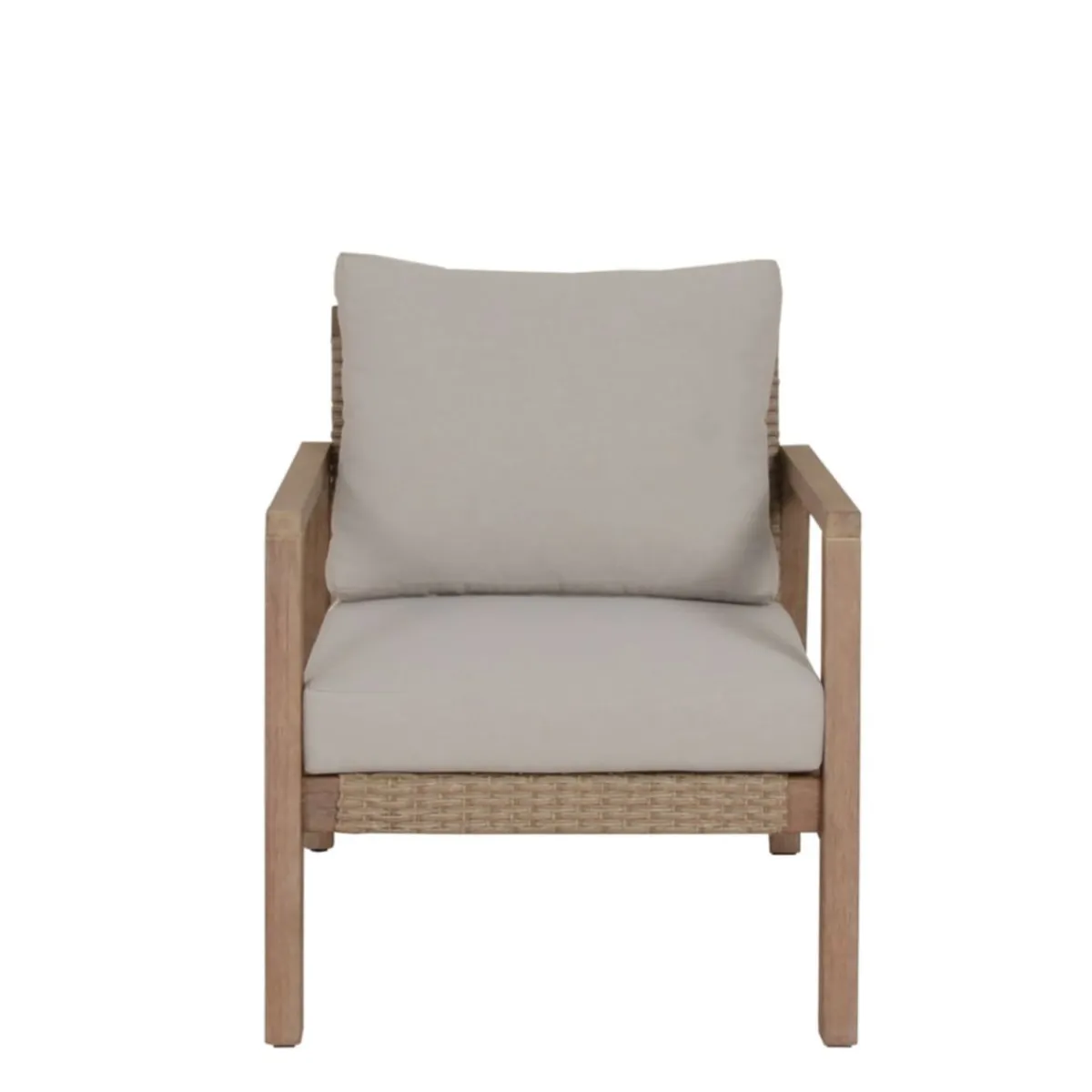 Das 4-teilige Lounge-Set SAN MATEO mit seiner eckigen Form ist die perfekte Wahl für Ihre Terrasse oder Ihren Garten. Hergestellt aus 100% FSC-Eukalyptusholz und strapazierfähigem Kunststoffgeflecht in washed braun/braun, ist dieses Set nicht nur robust, sondern auch äußerst ansprechend. Die beigefarbenen Polyesterkissen bieten einen hervorragenden Sitzkomfort und runden das elegante Design ab. Das Set umfasst einen Tisch, zwei Sessel und ein Sofa, was Ihnen genügend Platz bietet, um Ihre Outdoor-Entspannung in vollen Zügen zu genießen.