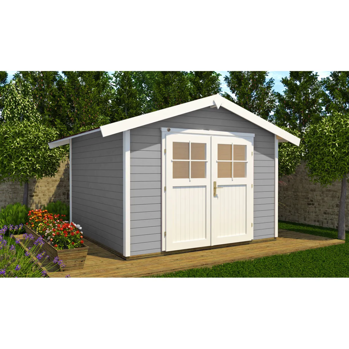 Das Weka Gartenhaus 122 Größe 5 grau ist ein geräumiges und robustes Gerätehaus, das sich perfekt für die Aufbewahrung Ihrer Gartengeräte eignet. Mit einer Grundfläche von fast neun Quadratmetern bietet es viel Platz für Rasenmäher, Schubkarren, Werkzeuge und vieles mehr. Das Satteldach mit einer Dachneigung von 19 Grad sorgt dafür, dass Regenwasser schnell abläuft und Ihr Inventar trocken bleibt.