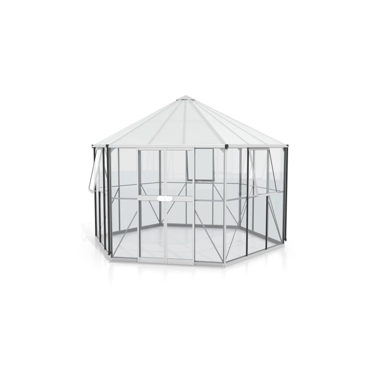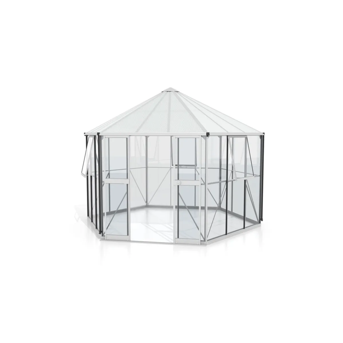 Mit dem Vitavia Gewächshaus Pi können Sie Ihre Pflanzen optimal vor Witterungseinflüssen schützen. Das freistehende Gewächshaus bietet eine Grundfläche von 12,878 m² und eine Durchgangshöhe von 183 cm. Es besteht aus robustem Aluminium und ist mit Einscheibensicherheitsglas (ESG) sowie Polycarbonat-Hohlkammerplatten verglast. Die Doppelschiebetür ist kugelgelagert und hat eine Türschwelle von 4,6 cm.