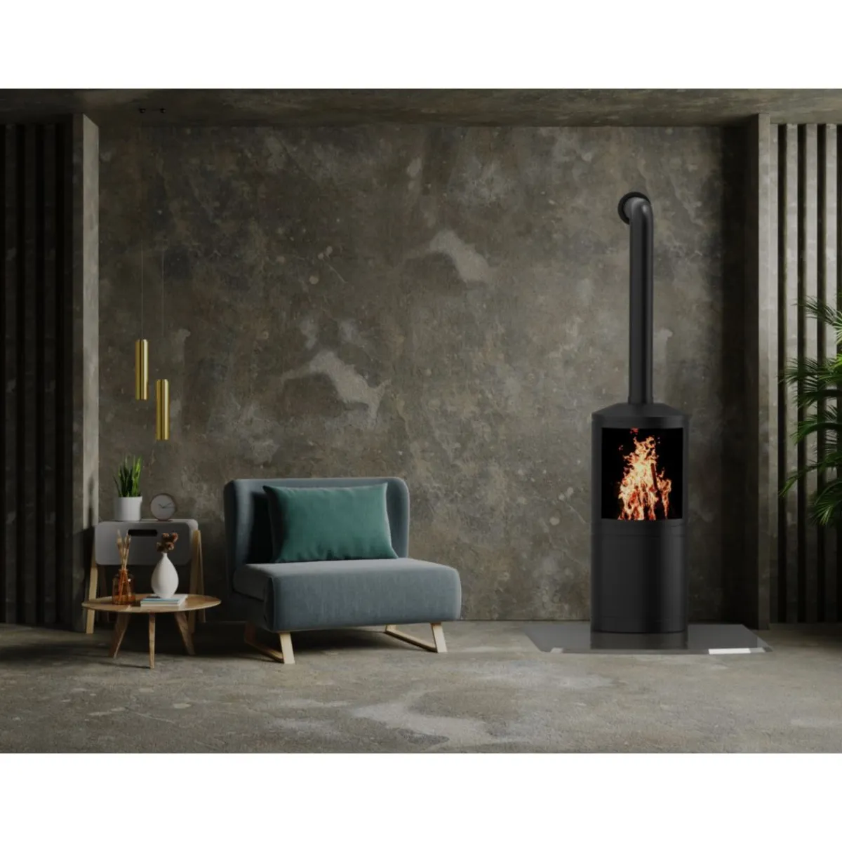 Der Kaminofen wirkt durch die ganzheitliche Positionierung auf dieser Glasbodenplatte wie ein Schmuckstück.