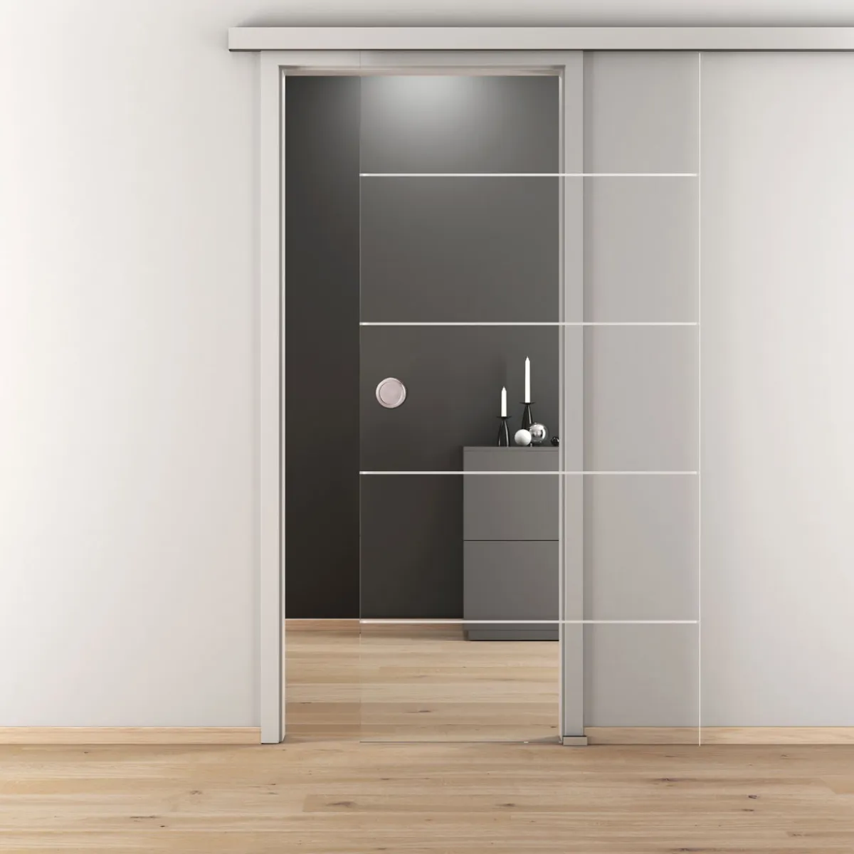 Die Novadoors Glasschiebetür NOVA 582 ESG klar ist die perfekte Wahl für alle, die klare Linien und modernes Design lieben. Mit ihrer transparenten Optik und den schmalen waagerechten Streifen setzt sie stilvolle Akzente in jedem Raum.