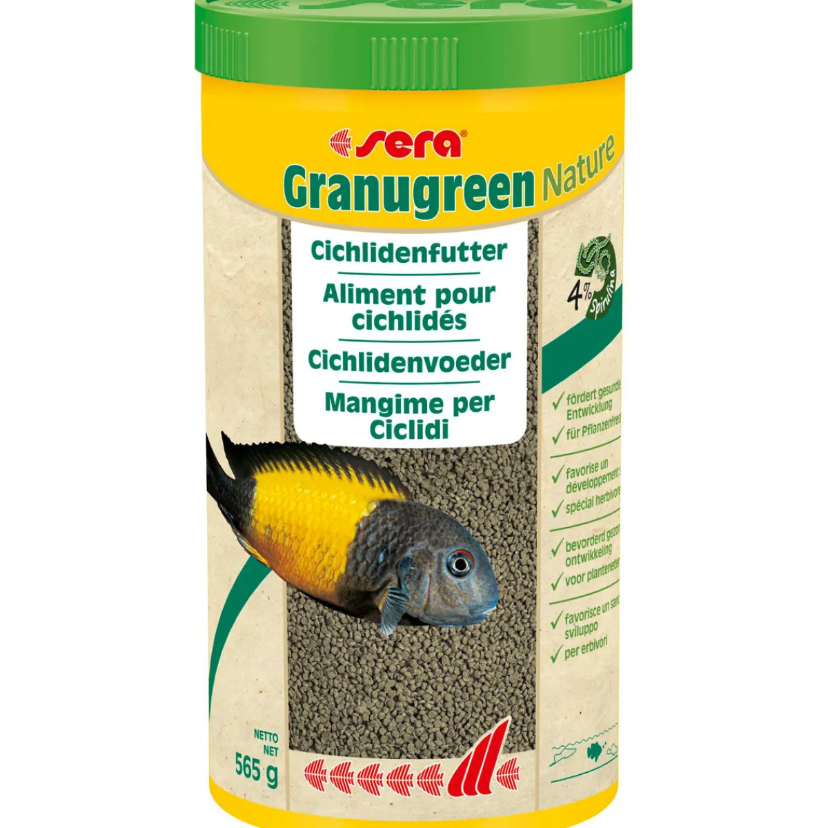 Das ballaststoffreiche Granulat für Cichliden Durch den hohen Anteil pflanzlicher Rohstoffe ist dieses Granulatfutter besonders für überwiegend Pflanzen fressende Cichliden (z. B. Cichliden des Malawi- und Tanganjika-Sees) geeignet. Das Futter enthält über 7 % leicht verdauliche Weizenkeime sowie Spirulina-Algen zur Förderung der natürlichen Farbenpracht. In Kombination mit granured stellt granugreen für omnivore (Alles fressende) Arten eine ausgewogene Ernährung dar. Neuimporte lassen sich problemlos auf das Futter umstellen. Es ist formstabil und bleibt so auch nach dem Absinken attraktiv. Alleinfuttermittel für Zierfische Verwendungshinweise: Mehrmals täglich sparsam füttern, nur so viel, wie die Tiere in kurzer Zeit aufnehmen. Zusammensetzung: Fischmehl, Maisstärke, Weizenkleber, Weizenmehl, Weizenkeime (7,2 %), Brauereihefe, Fischöl, Petersilie, Spirulina (1,6 %), Brennnessel, Kräuter, Luzerne, Seealgen, Paprika, Spinat, Karotten, Grünlippmuschelmehl, Knoblauch Qualitätsanalyse: Rohprotein: 40,6%, Rohfett: 8,9%, Rohfaser: 3,6%, Rohasche: 4,8%, Feuchtigkeit: 5,0% Zusatzstoffe, Vitamine und Provitamine pro kg: Vit. A: 30000 IU, Vit. B1: 30 mg, Vit. B2: 90 mg, Vit. C: 550 mg, Vit. D3: 1500 IU, Vit. E: 60 mg