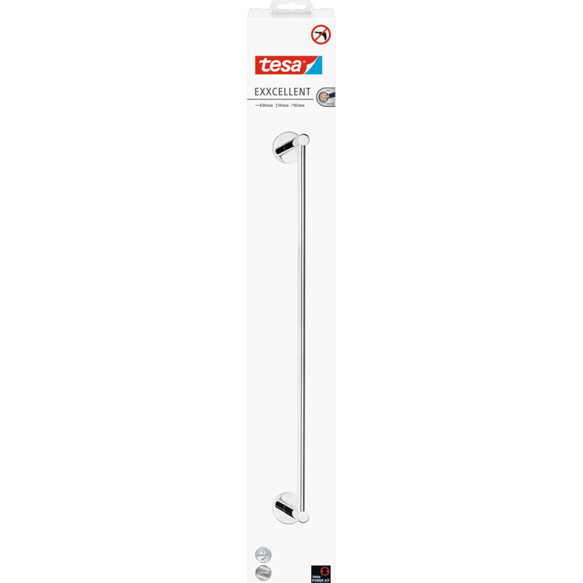 Verleihen Sie Ihrem Badezimmer ein modernes und elegantes Flair mit der Tesa Handtuchstange Exxcellent! Diese stilvolle Handtuchhalterung in silberner Grundfarbe begeistert nicht nur durch ihr hochwertiges Design, sondern auch durch ihre innovative Funktionalität. Mit einer Breite von 630 mm bietet sie großzügigen Platz für Ihre Handtücher und sorgt dafür, dass diese stets griffbereit sind. Dank der patentierten tesa® Power.Kit Befestigungstechnologie ist die Montage kinderleicht und hinterlässt keine unschönen Bohrlöcher an Ihren Wänden. Das verchromte Metallmaterial verleiht der Stange eine langlebige Qualität, die sich perfekt in jedes Badezimmerambiente einfügt.