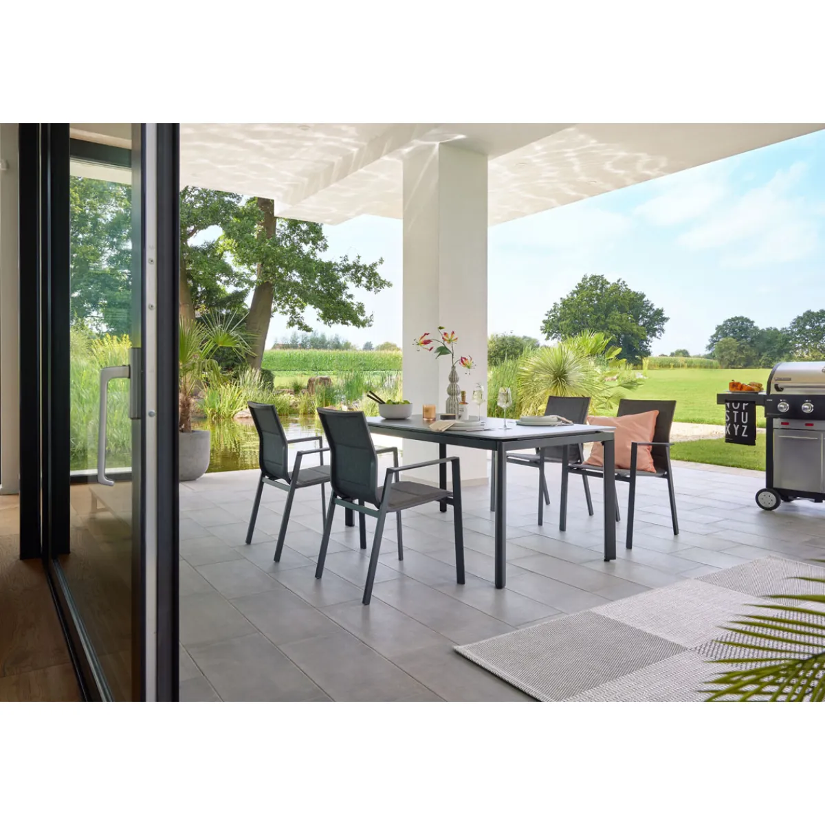 - Pulverbeschichtetes Aluminiumgestell in Grau bietet Stabilität und Schutz vor Witterungseinflüssen