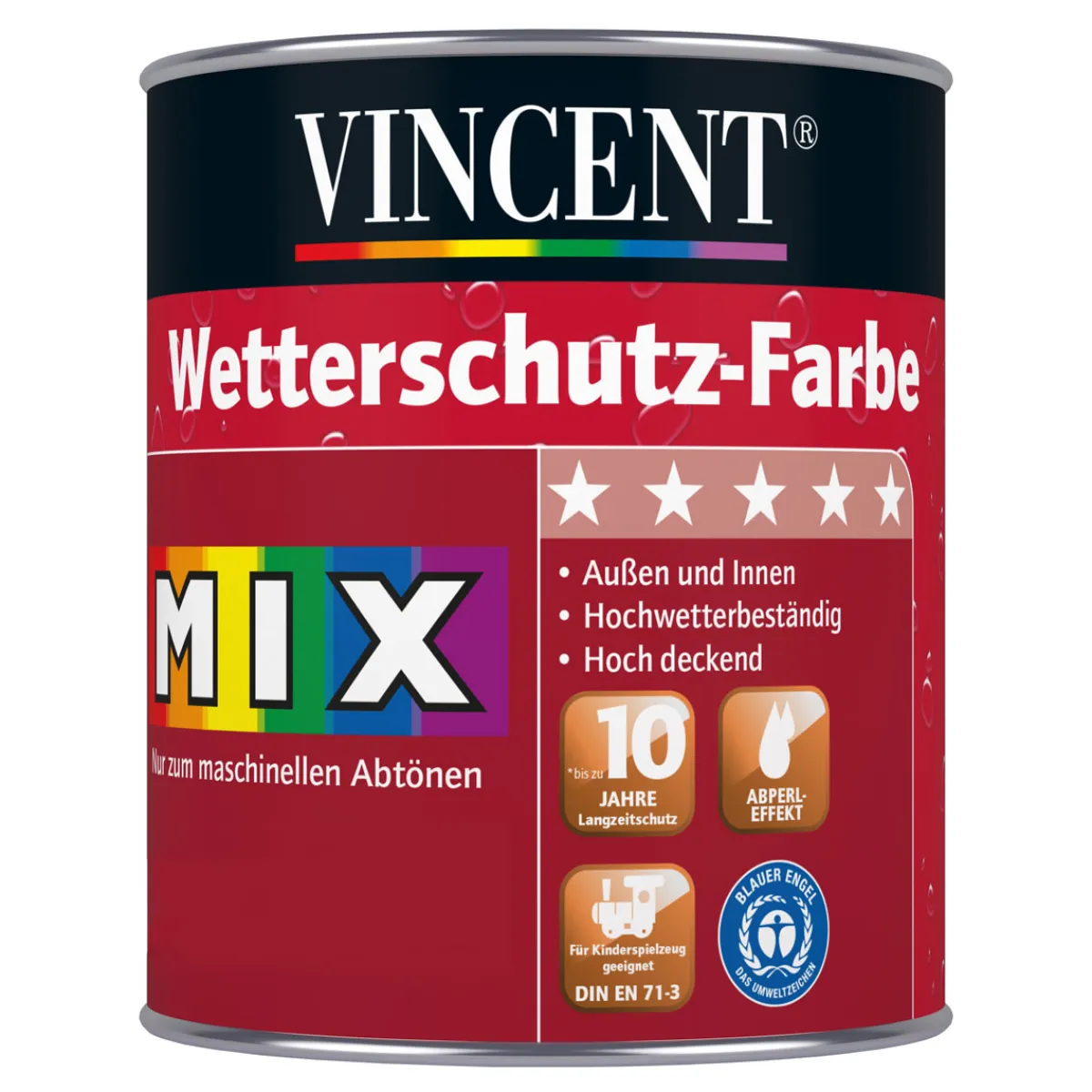 Die VINCENT Wetterschutzfarbe ist ein Holzanstrich für wetterbeständigen Langezeitschutz. Die Farbe ist ideal geeignet für alle Hölzer außen und innen wie Verkleidungen, Giebel, Türen, Fensterläden, Holzhäuser, Zäune, Möbel etc.Der Untergrund muss tragfähig, sauber, fest, trocken, fett- und wachsfrei sowie frei von geschlossenen Lackfilmen sein.Die VINCENT Wetterschutzfarbe ist wasserbasiert, stark wasserabweisend mit einem Abperl-Effekt, hochwetterbeständig, stoß- und schlagfest, vergilbungs- und scheuerbeständig, leicht zu verarbeiten, schnell trocknend, geruchsarm und hochelastisch. Diese hoch deckende Farbe ist ebenfalls für Kinderspielzeug geeignet und bietet einen Langzeitschutz von bis zu 10 Jahren.Vor Gebrauch gut aufrühren. Die Oberfläche ist nach ca. 2 h trocken und nach ca. 12 h überstreichbar.Dieser Artikel lässt sich in Ihrem Wunschfarbton mischen.