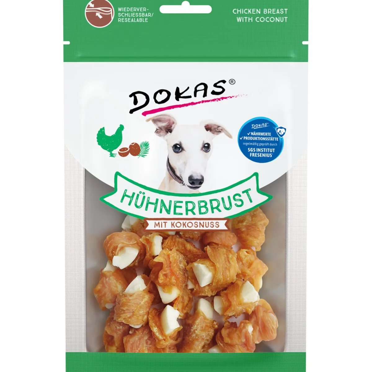 Hühnerbrust in einer ganz besonderen Kombination – Kokosspalten mit feinem Hühnerbrustfilet umwickelt. Die kleinen Happen sind für den Hund eine schmackhafte Abwechslung, aber auch eine gesunde Belohnung für zwischendurch. Die Kokosnuss enthält viele Vitamine und Mineralstoffe, die das Wohlbefinden ihres Hundes unterstützen können.
