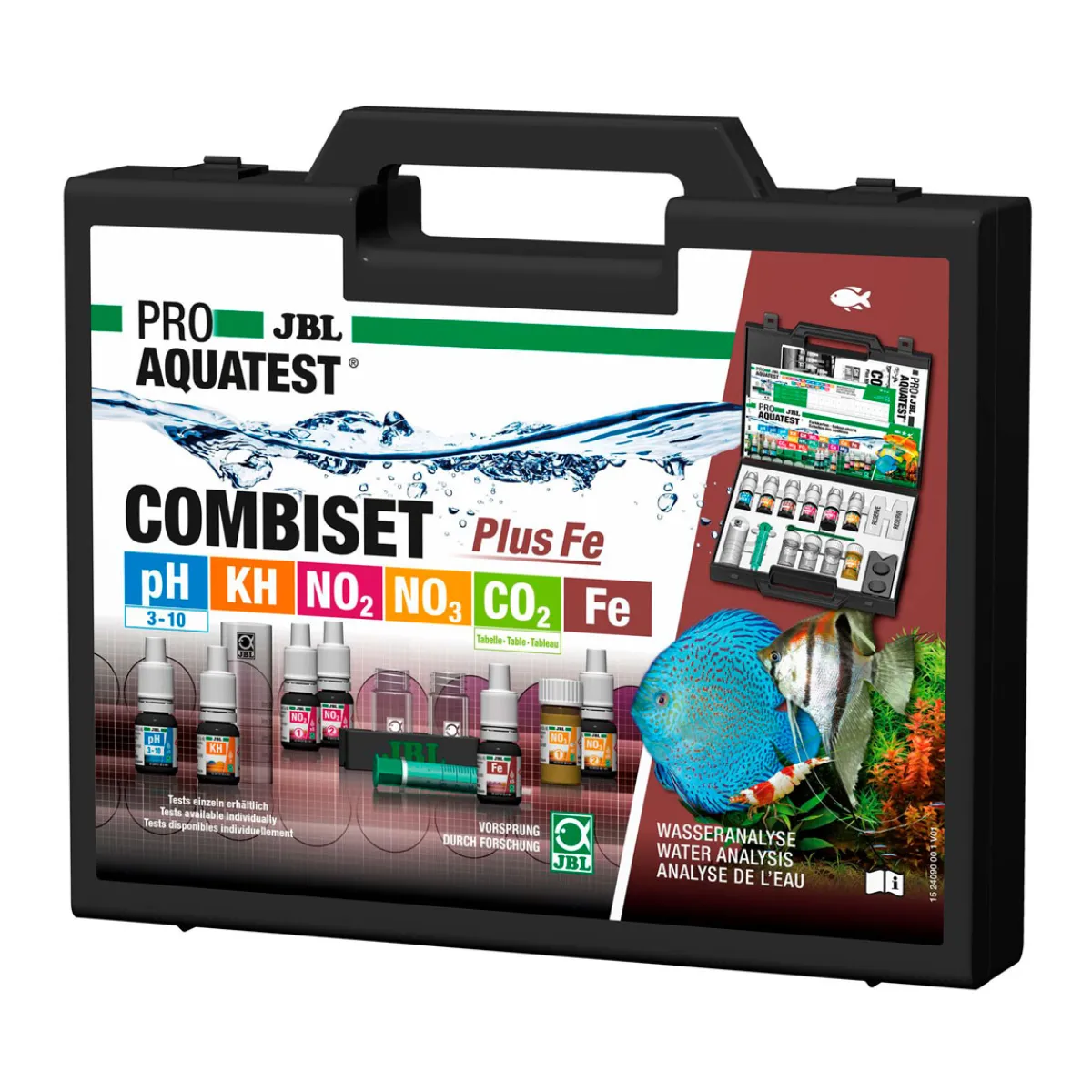1 Testkoffer für Aquarien.7 Reagenzien,3 Glasküvetten,Spritze,Dosierlöffel,Komparatorblock,Kunststoffküvette,Farbkarten,Protokollblätter, Bedienungsanleitung.