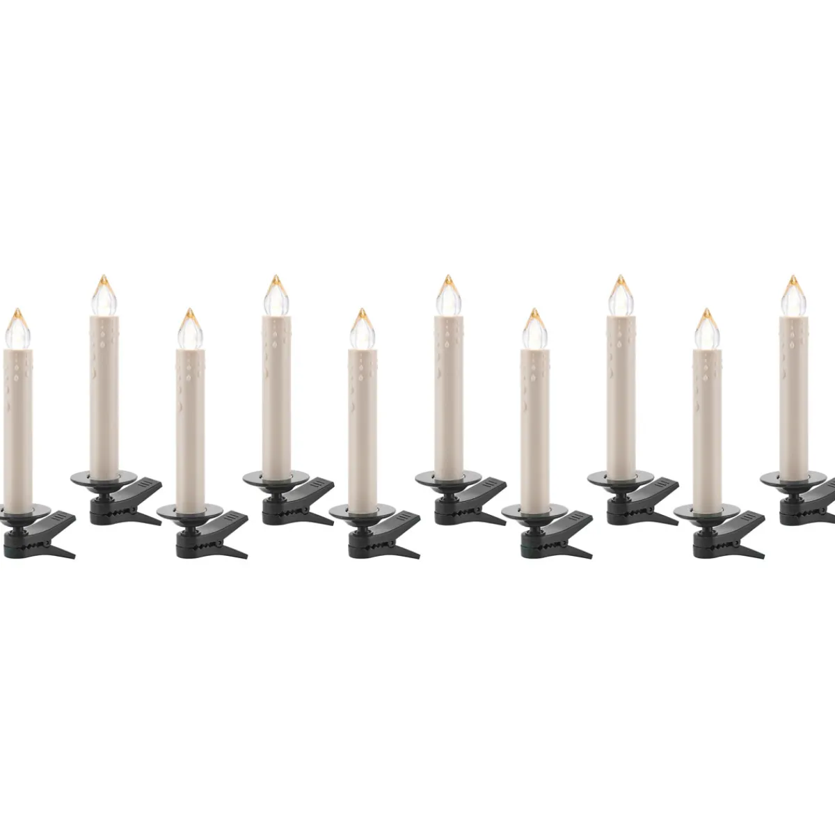 Das kabelloste LED-Kerzen-Set ist batteriebetrieben und für den Innenbereich geeignet. Die Batterien sind nicht im Lieferumfang enthalten. Benötigt werden 10 x AAA Batterien. Die Kerzen haben die Farbe elfenbein und jede Kerze hat eine warmweiße LED. Zwei Lichtintervalle können ausgewählt werden. Die Variante starr oder flackernd / dimmbar. Jede Kerze hat ein Befestigungsclip. Zudem ist eine IR Fernbedienung in dem Set enthalten. Eine Kerze hat die Höhe 12,5 cm und einen Durchmesser von 1,4 cm.