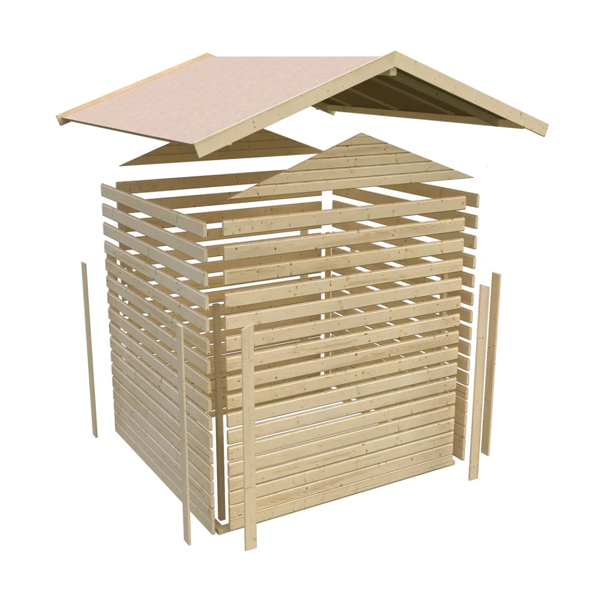 Das Gartenhaus wird aus 19 mm starken Wandbrettern aus nordischer Fichte im Steck-/Schraubsystem gefertigt und gewährleistet somit einen einfachen Aufbau. Das Satteldach besteht aus Dachplatte. Die Grundfläche beträgt 3,16 m² bei einem umbauten Raum von 6,1 m³. Mit einer Seitenhöhe von 172 cm und einer Firsthöhe von 201 cm bietet das Gerätehaus optimale Raumnutzung. Das Gartenhaus ohne Anbauten hat ein Sockelmaß von 182×182 cm. Bodenbalken sorgen für den Schutz von unten und werden unter das Gartenhaus gelegt. Durch die Kesseldruckimprägnierung der Bodenbalken sind diese vor Witterungseinflüssen und holzzersetzenden Pilzen bereits geschützt. Die praktische und vormontierte Tür sorgt mit ihren großzügigen Abmessungen und dem Massivholzrahmen für einen einfachen Zutritt in das Gartenhaus und sichert den Inhalt nebenbei effektiv vor unbefugtem Zugriff. Die Verglasung der Lichtausschnitte sorgt für großzügigen Tageslichteinfall.