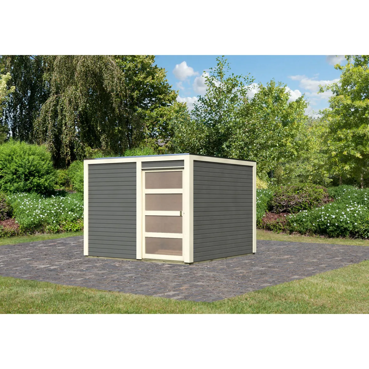 Gefertigt ist dieses Modell mit Flachdach aus dem nachwachsenden Rohstoff Holz. Damit ist hier für ein tolles Raumklima ebenso gesorgt wie für Stabilität und eine praxistaugliche und flexible Handhabung. Ideal zum übrigen Design passt außerdem ebenfalls die Farbe, in der das Modell zu Ihnen kommt. Grau passt gut in eine grüne Umgebung.