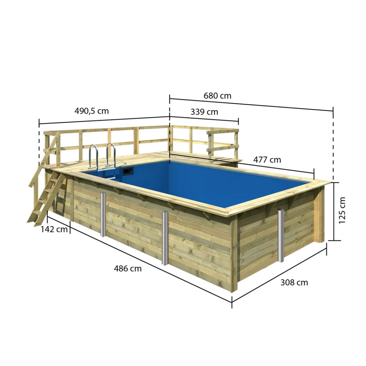 Mit dem Karibu Pool Größe 3 holen Sie sich das ultimative Badeerlebnis in Ihren Garten. Das hochwertige Fichtenholz und die robuste PVC-Innenfolie machen den Pool zu einem langlebigen Begleiter für heiße Sommertage. Mit einer Wassertiefe von 111 cm und einem Fassungsvermögen von 15.500 Litern bietet der Pool ausreichend Platz zum Planschen und Schwimmen.