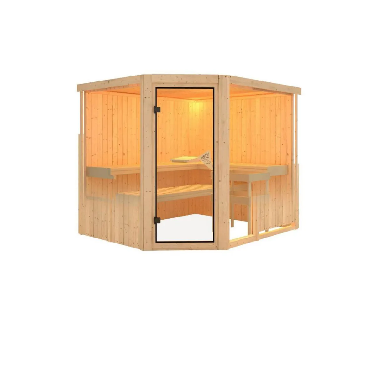 Erleben Sie pure Entspannung in der eigenen Sauna mit der Karibu Systemsauna Fiona 3. Die hochwertige nordische Fichte und die Eckeinstiegstür machen das Saunieren zum Erlebnis.