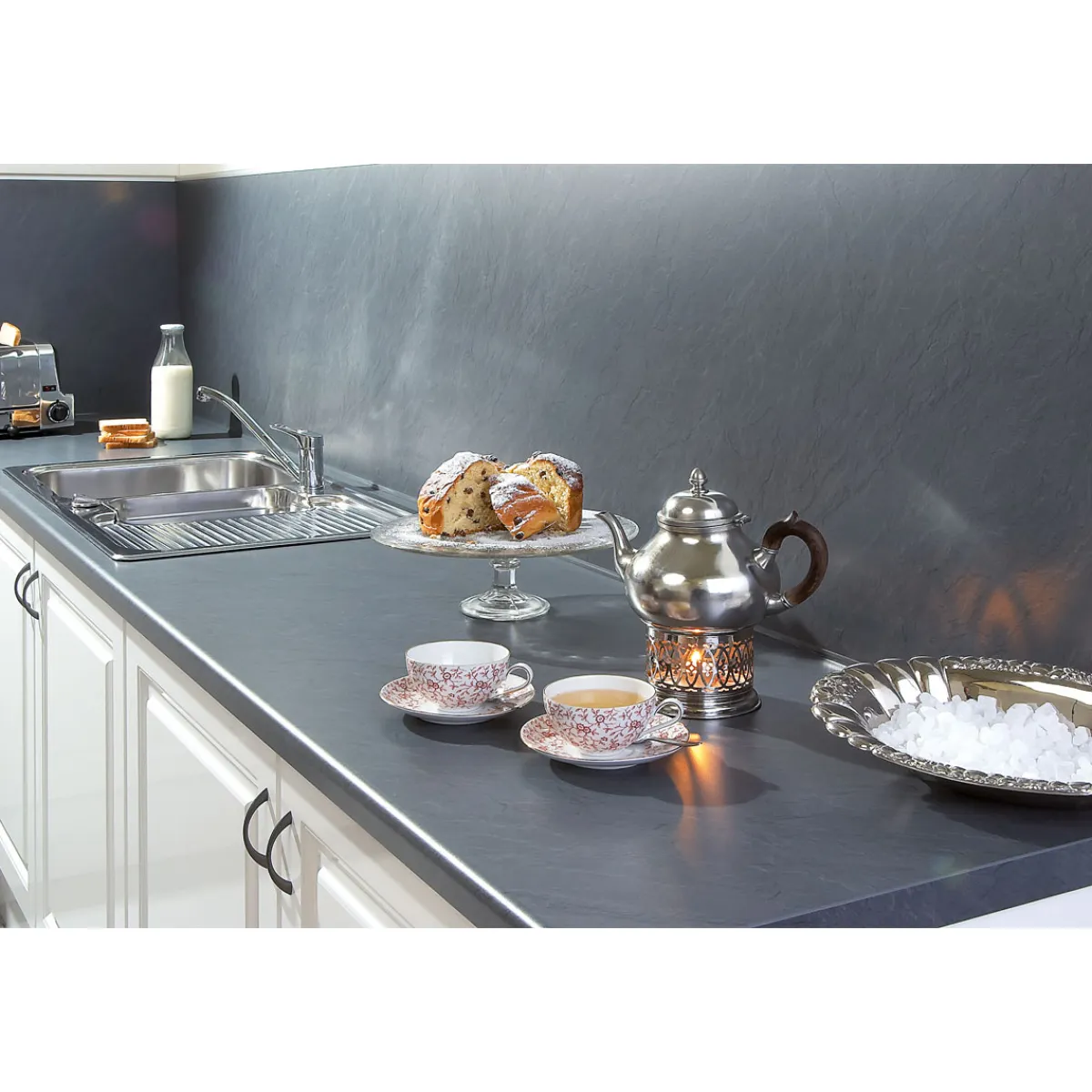 Die Getaelements Küchenarbeitsplatte Porto Schiefer bietet nicht nur ein ansprechendes Design, sondern auch hervorragende Eigenschaften wie Wasserdampfbeständigkeit und Abriebfestigkeit. Sie ist zudem beständig gegen haushaltsübliche Reiniger und geeignet für den Kontakt mit Lebensmitteln. Diese Arbeitsfläche wird Ihnen viele Jahre Freude bereiten.