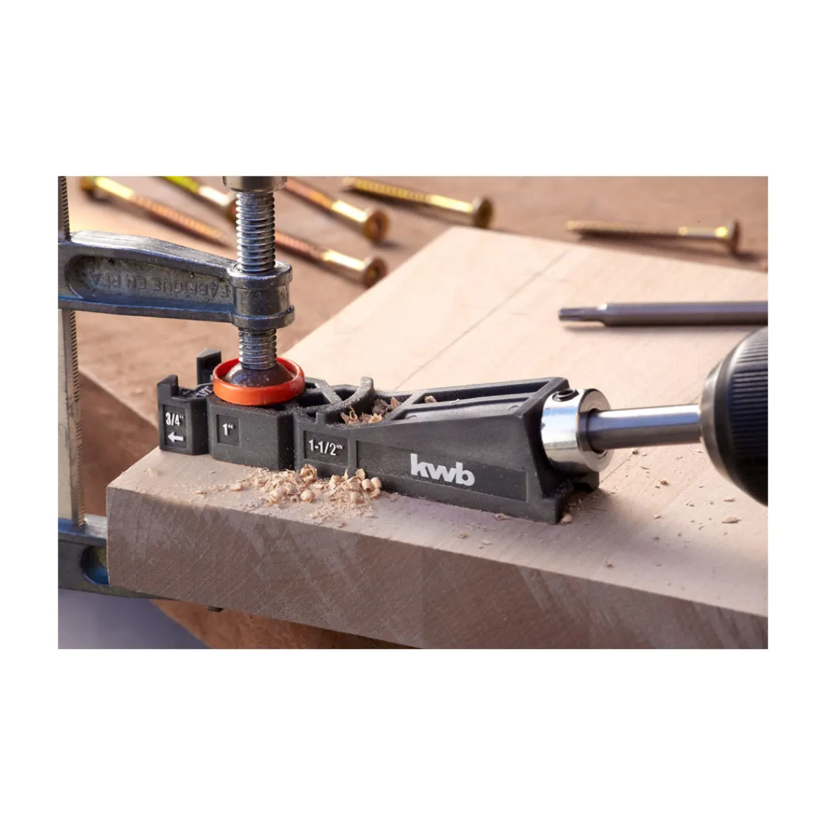 Mit der kwb Bohrschablone Taschenloch 5 teilig wird das präzise Arbeiten beim Holzverbinden zum Kinderspiel. Die Schablone enthält alles, was man für eine perfekte Verbindung benötigt.