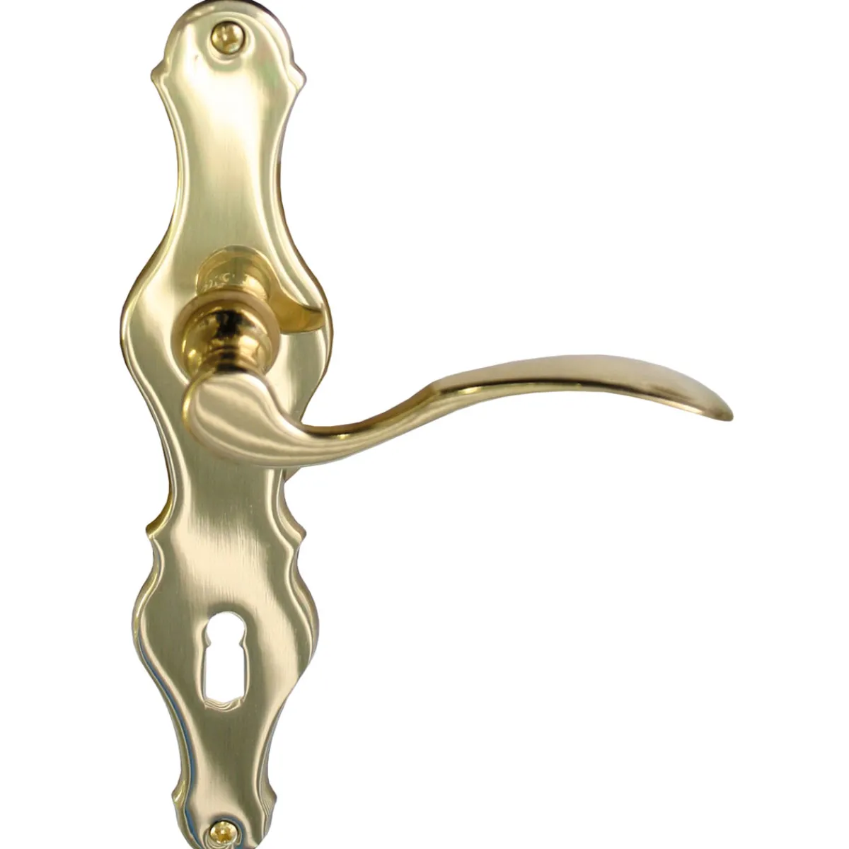 Die Alpertec Langschildgarnitur Susan-LS poliert 72 mm ist eine verzierte Drückergarnitur, die sich perfekt für Zimmertüren eignet. Mit ihrem verschnörkelten Schild und dem goldfarbenen Messingmaterial verleiht sie jeder Tür einen edlen Touch.