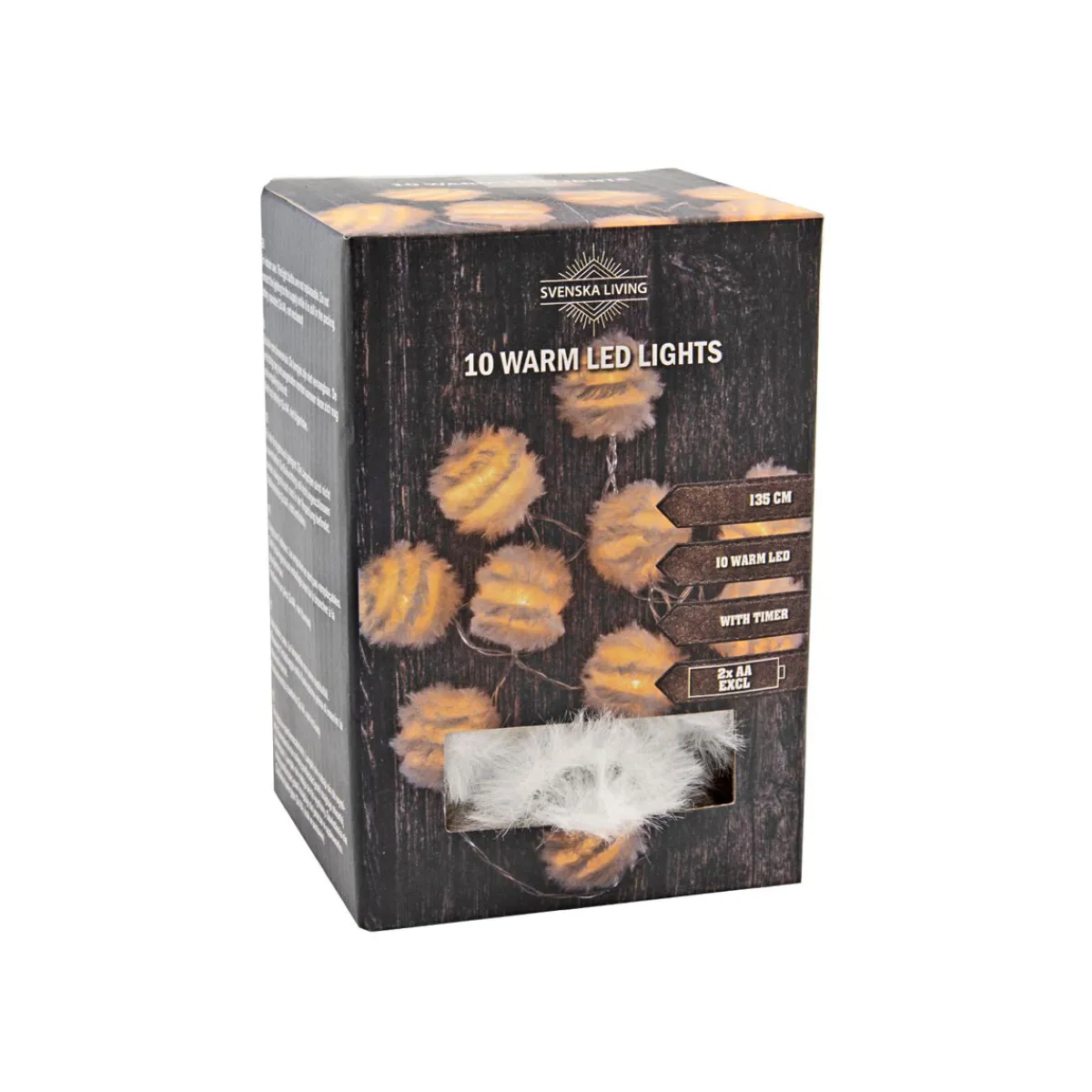 Die Lichterkette besteht aus Federpompoms und wird mit 2 x AA Batterien (nicht im Lieferumfang enthalten) betrieben. Die Lichterkette verleiht ihrer Weihnachtsdekoration eine schicke Atmosphäre.