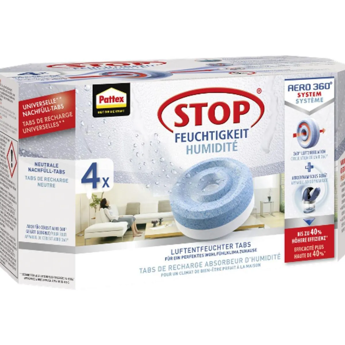 Die Pattex Stop Feuchtigkeit AERO 360° Nachfüll-Tabs sind ideal für alle Kunden, die mit feuchten Räumen zu kämpfen haben und eine einfache Lösung suchen, um das Raumklima zu verbessern.