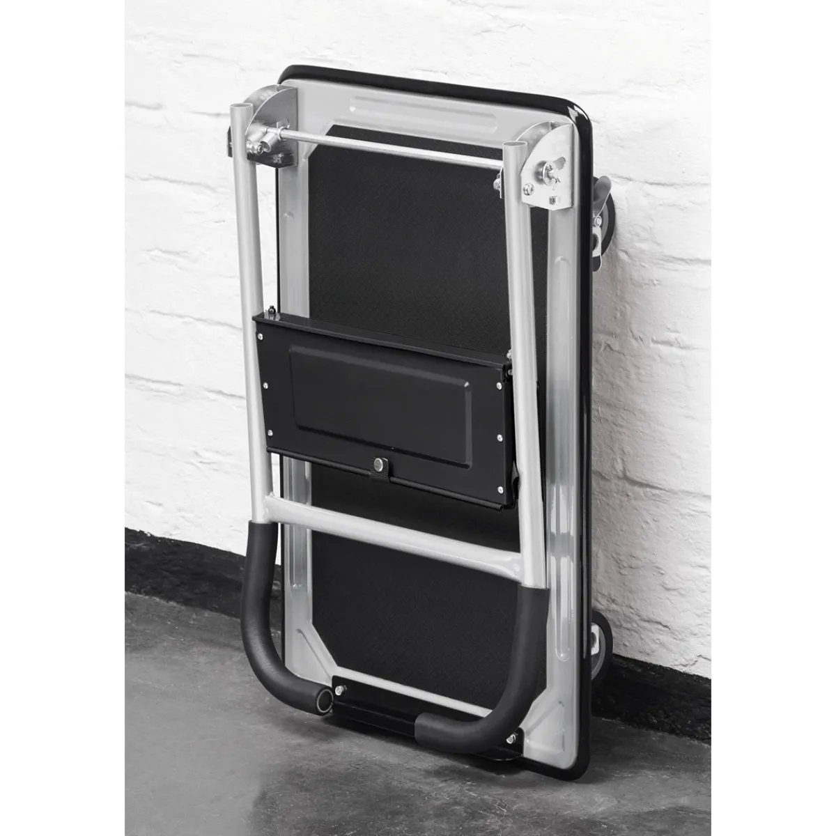 Wer einen zuverlässigen und robusten Helfer für den Transport von schweren Gegenständen sucht, ist mit dem Meister Plattformwagen Cut Off bestens beraten. Zahlreiche praktische Eigenschaften wie die integrierten Ösen zur Sicherung der Ladung oder das Aufbewahrungsfach am Bügel machen ihn zu einem unverzichtbaren Begleiter in Werkstatt und Lager. Die Montage von Rädern und Ösen geht leicht von der Hand und auch das Zusammenklappen des Bügels erfolgt schnell und einfach per Fußbedienung.