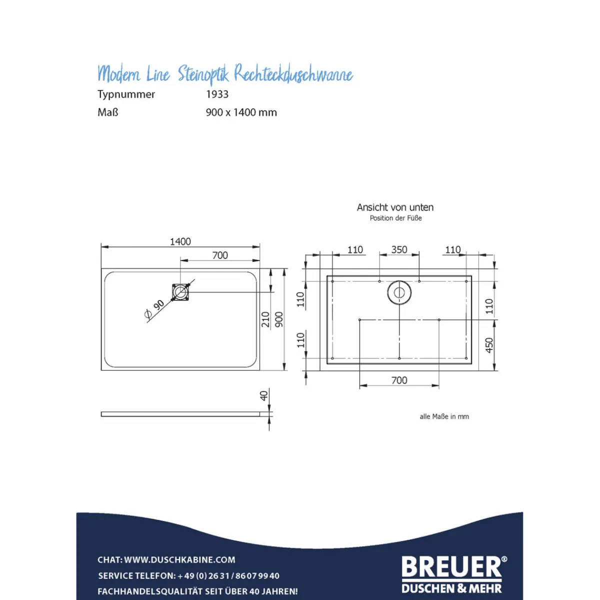 Mineralgruss-Duschwanne Modern Line Steinoptik, Anthrazit, 900 / 1400 mm*Breuer