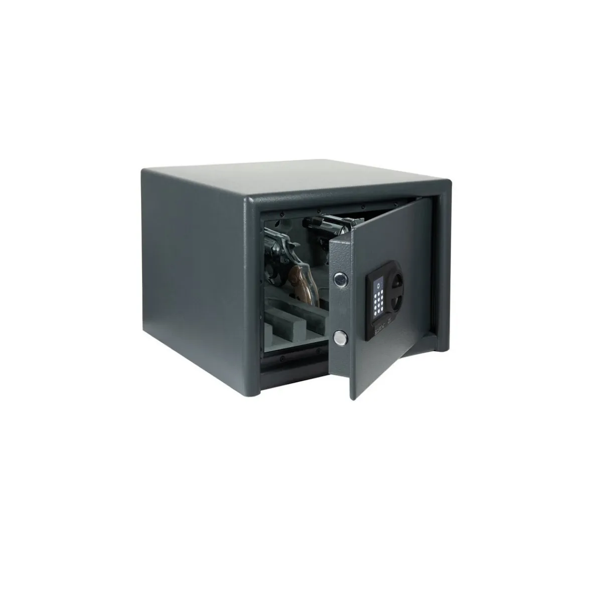 Mit seiner robusten Konstruktion aus doppelwandigem Stahl und Rundbolzenverriegelung bietet dieser Tresor ein hohes Maß an Sicherheit gegen Einbruchversuche. Durch seine Größe von 49,5 x 36 x44,5 cm und einem Volumen von 28 Litern bietet er ausreichend Platz zur Aufbewahrung von Kurzwaffen oder anderen wertvollen Gegenständen. Die Möglichkeit zur Wandmontage sorgt zusätzlich für eine stabile Verankerung im Raum.
