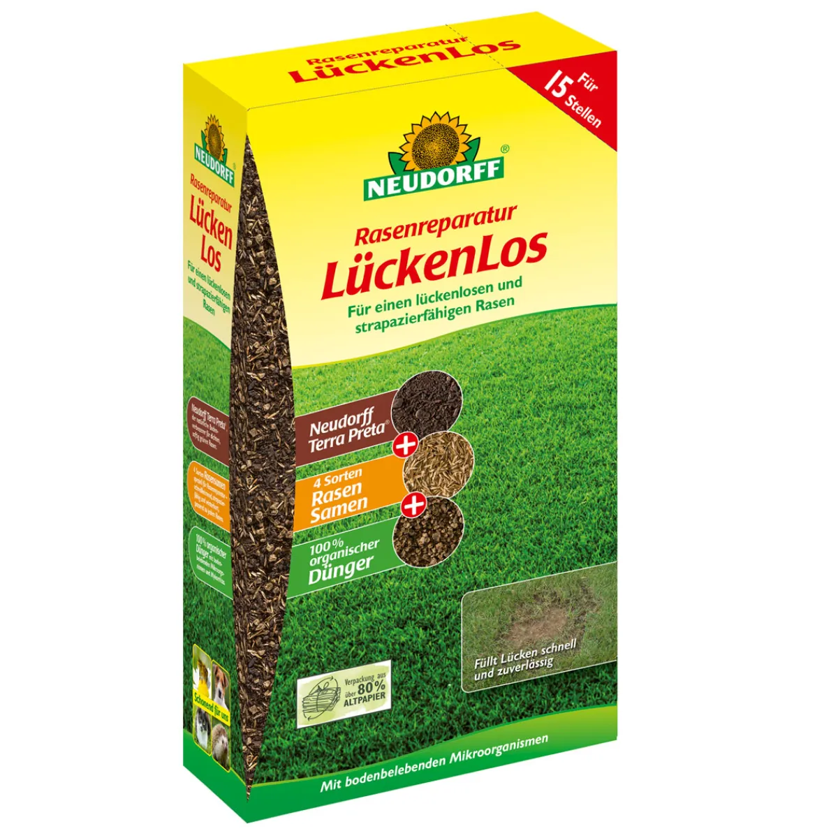 Neudorff LückenLos ist ideal für alle Kunden, die eine schnelle und einfache Lösung zur Reparatur ihrer beschädigten oder lückenhaften Rasenflächen suchen.