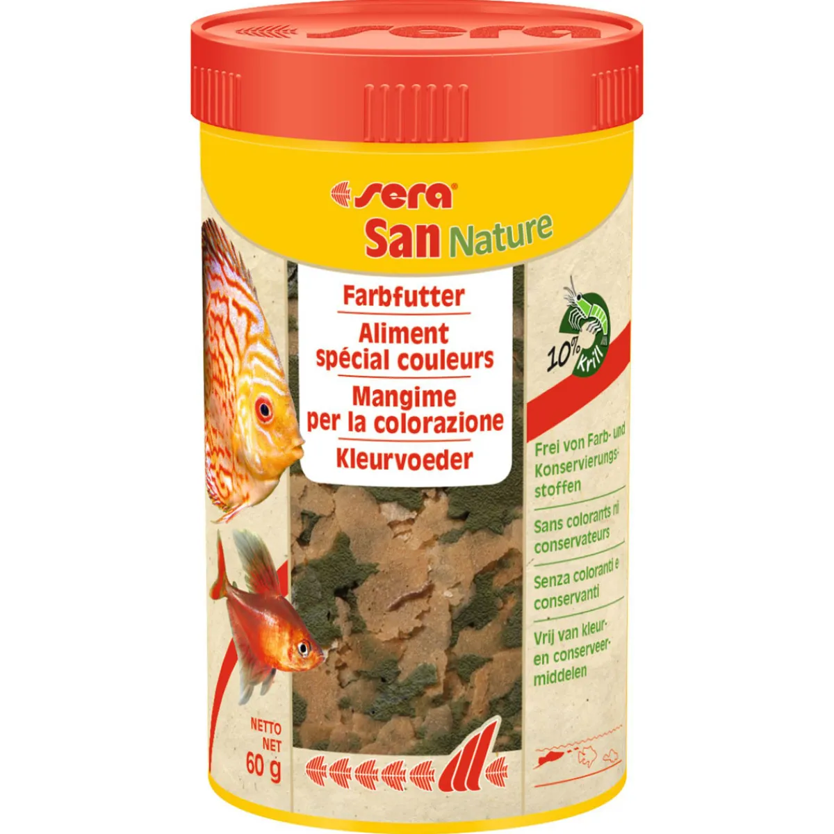 sera San Nature ist das natürliche Farbfutter, das ohne Farb- und Konservierungsstoffe auskommt. Die Farbentwicklung wird ausschließlich durch die natürlichen Inhaltsstoffe wie astaxanthinreiche Haematococcus-Algen und Krill gefördert. Gleichzeitig erhöhen sie auch die Akzeptanz, Vitalität und Laichbereitschaft der Zierfische. Die formstabilen Flocken eignen sich für alle an der Oberfläche fressenden Zierfische und trüben nicht das Wasser.