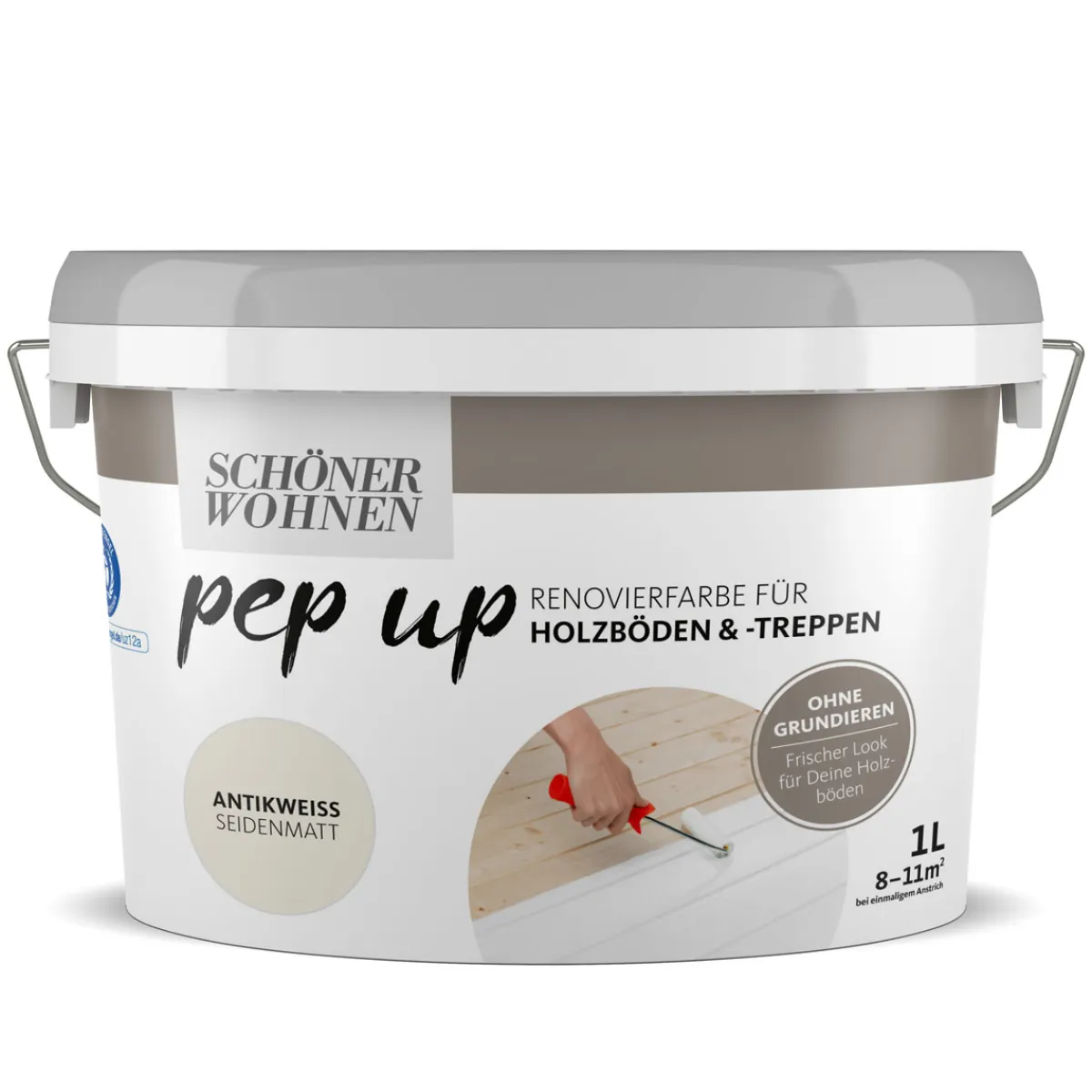 Mit Schöner Wohnen Farbe pep up Holzböden und -treppen antikweiß verleihst du deinem Zuhause im Handumdrehen eine warme, gemütliche Atmosphäre. Der seidenmatte Glanzgrad sorgt für eine angenehme Optik, während die hohe Deckkraft des Fußbodenlacks dafür sorgt, dass dein Boden oder deine Treppe optimal geschützt sind.